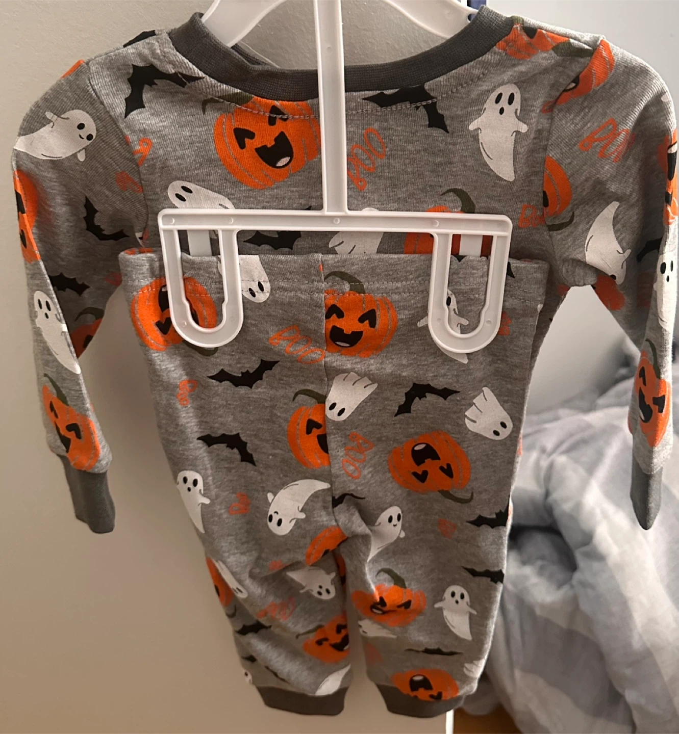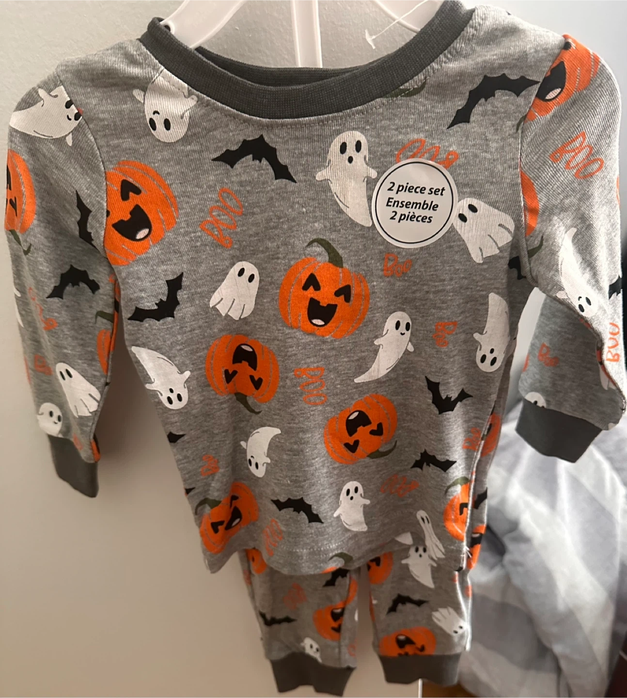 Super cute Halloween-themed two-piece pajama set! It features a fun pattern with ghosts, pumpkins, and bats on a grey background. Perfect for your little one to wear during the spooky season!