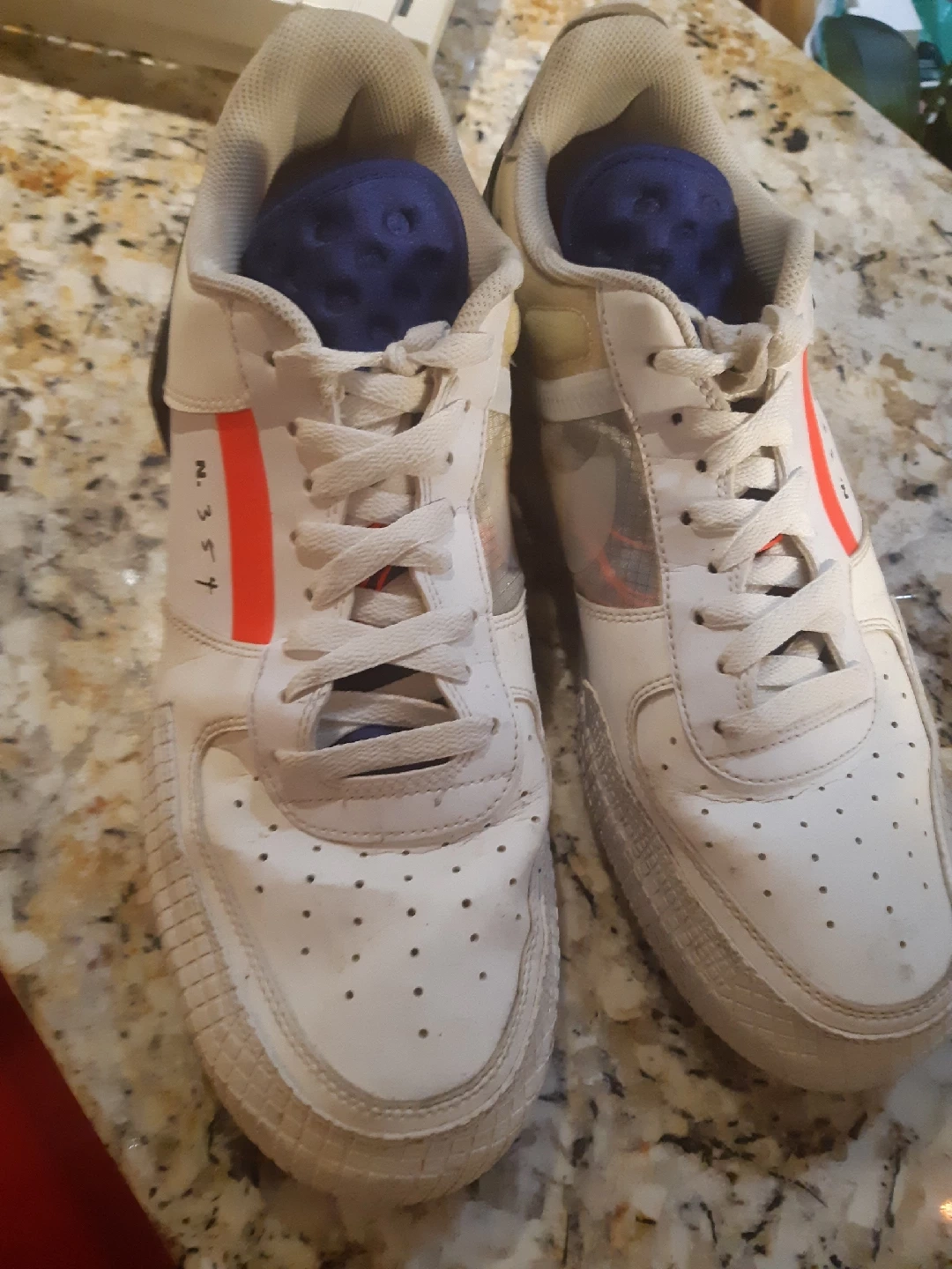 Selling a pair of Nike Air Force 1 Experimental N.354 sneakers in size 12 They have a unique design with a white base, orange and black accents, and the N.354 branding. They show some signs of wear but are still in good condition for everyday use!