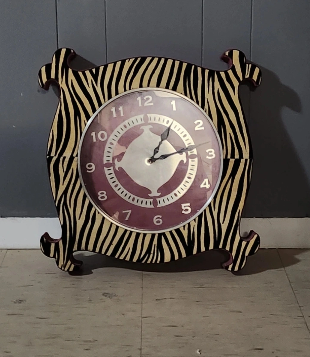 Unique and eye-catching wall clock with a zebra print frame! The clock face has a maroon background with silver hands and numerals. It would make a great addition to any room with a fun, funky style