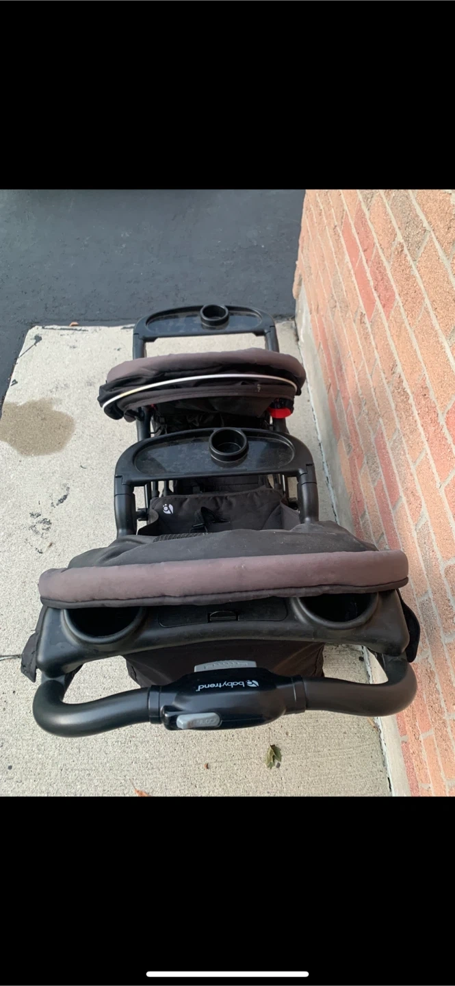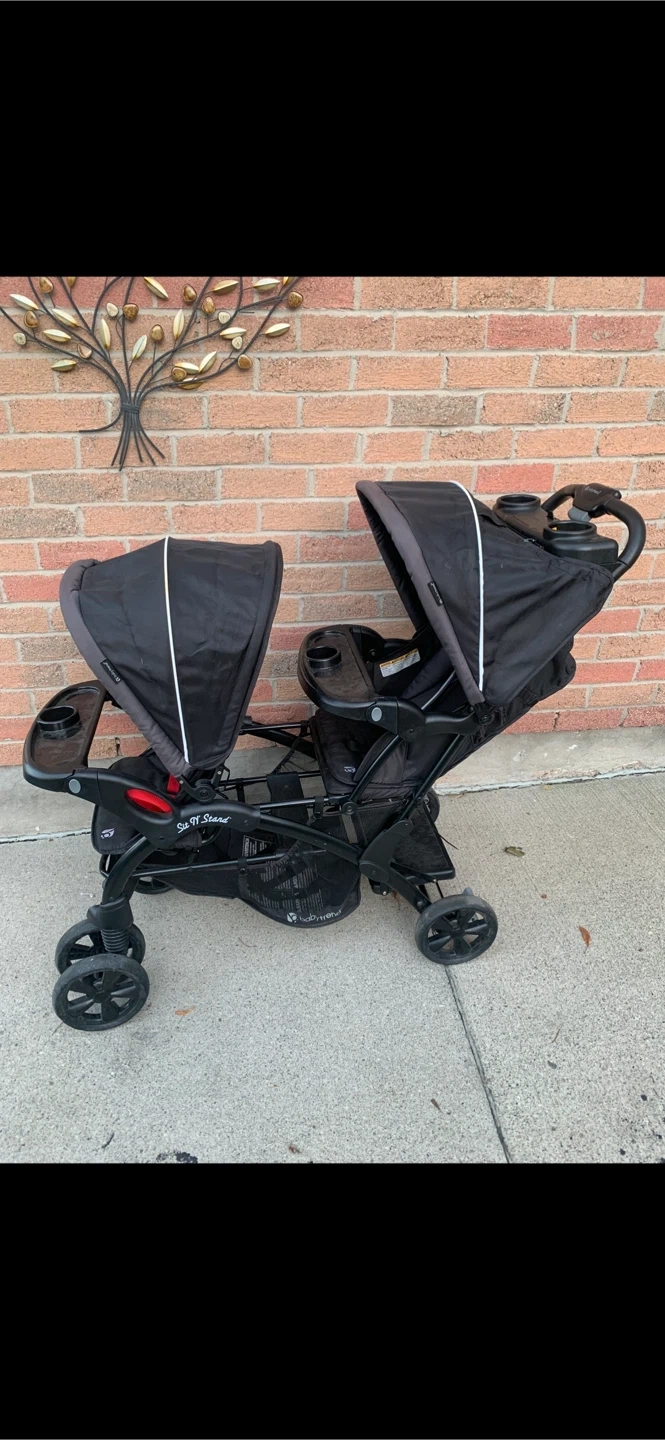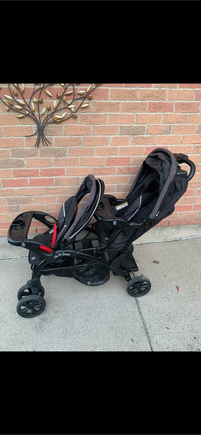 Baby Trend Sit N' Stand Double Stroller The Baby Trend® Sit N'Stand® Double is the perfect solution for families with multiple kids and babies. When you are on the go with your little ones, this Stroller will make travel seamless. The Sit 'N Stand combines maximum comfort with sleek style and will make your trip to the park or anywhere, easy and enjoyable. Equipped with two full size seats, a bench seat and a standing platform, both seats have a 5-point safety harness for maximum security. The front seat has a removable 2 panel fully ratcheting canopy and the rear seat has a fixed canopy with visors to block the sun. This Stroller also includes a hassle free one-hand fold, an extra-large basket for all your travel necessities and a parent console with two cup holders and a covered compartment. Push 2 your kids on 1 stroller at the same time! No more taking turns or choosing which child gets to sit, able to seat 2 kids at once! * Children can sit in the front and rear seats of this stroller or stand on the rear platform * Covered parent tray with 2-cup holders * One hand fold is fast and easy to use * 5-point child restraint safety harness * Removable/Swing away child tray with cup holder * Removable rear seat converts stroller to traditional Sit N Stand * -Foot activated rear brake. The back seat converts to a stand if wanted, using Patented technology, your kid can stand safely while being pushed in the stroller or sit, has the options! Using patented and trademarked technology, only this stroller can do that and others cant! Can be picked up or delivered Cheap - message me