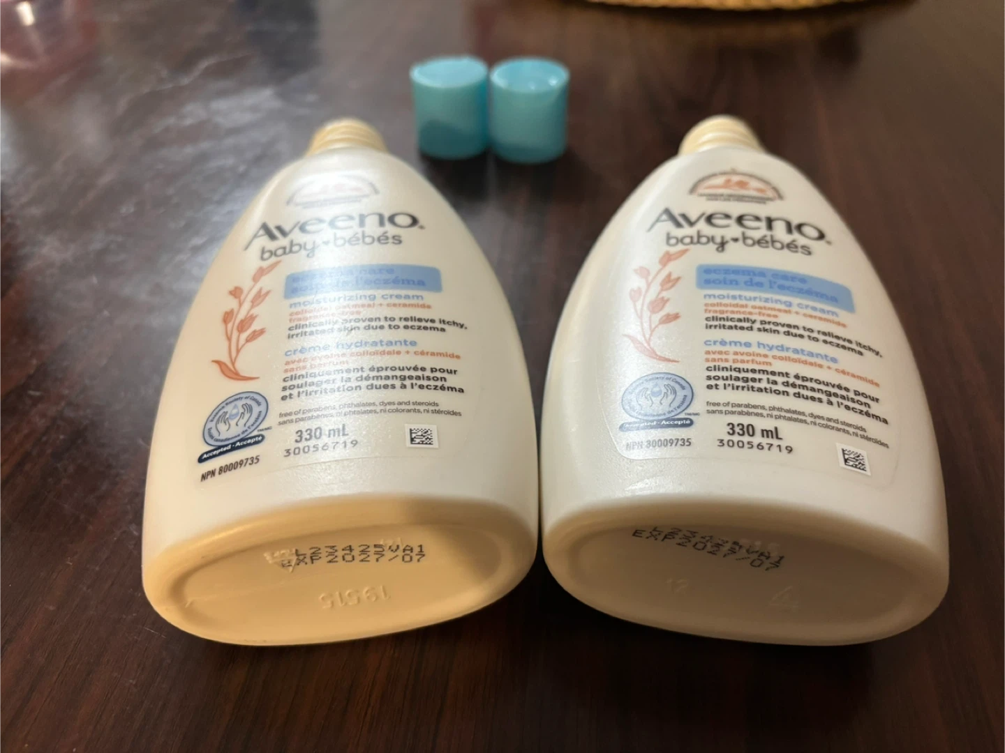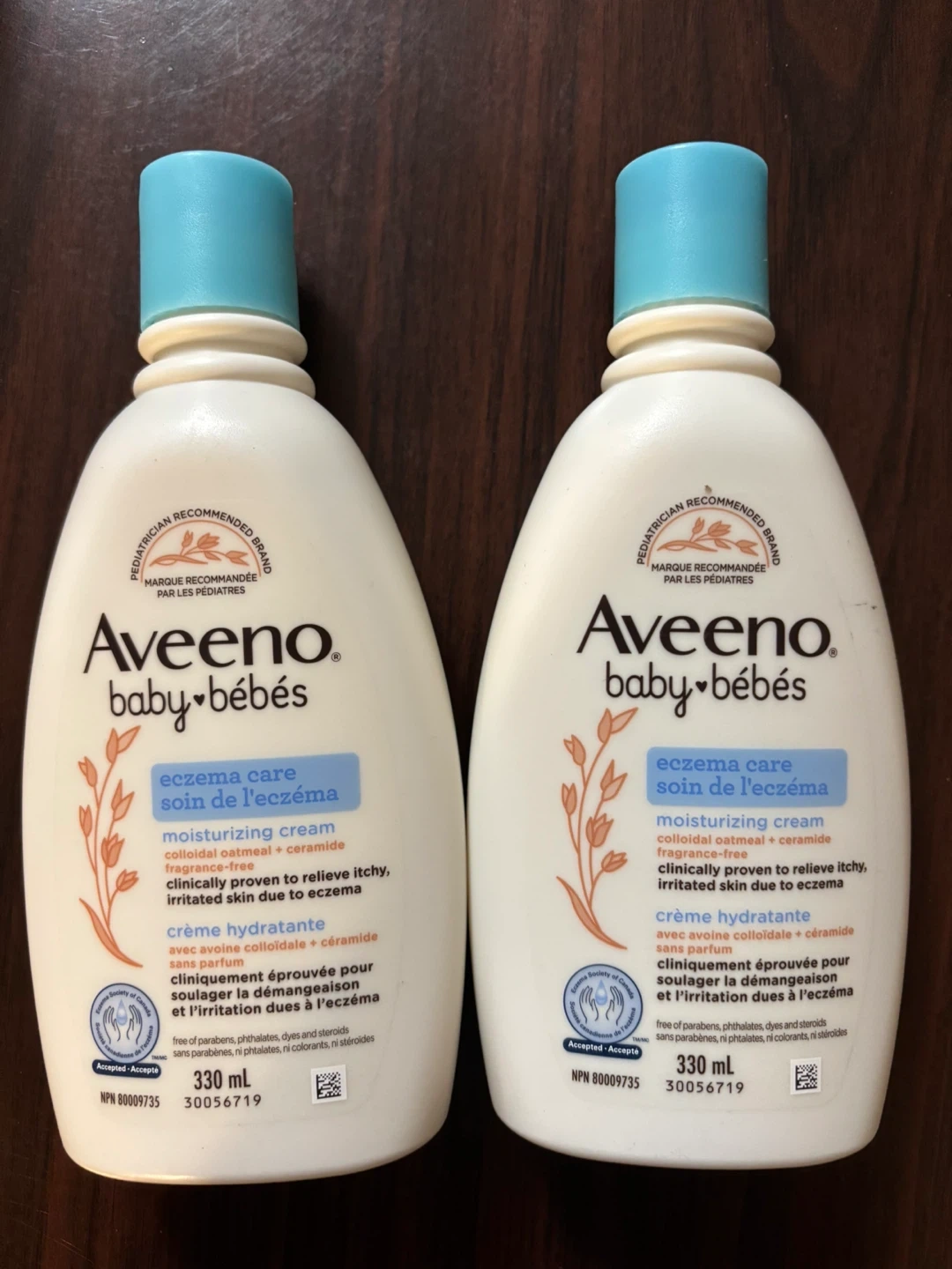 Selling these brand new Aveeno Baby Eczema Care Daily Moisturizing Body Cream for Sensitive Skin, Soothing Eczema Relief Cream, Colloidal Oat & Ceramide for Dry & Itchy Skin, Steroid- & Fragrance-Free, 330 mL.