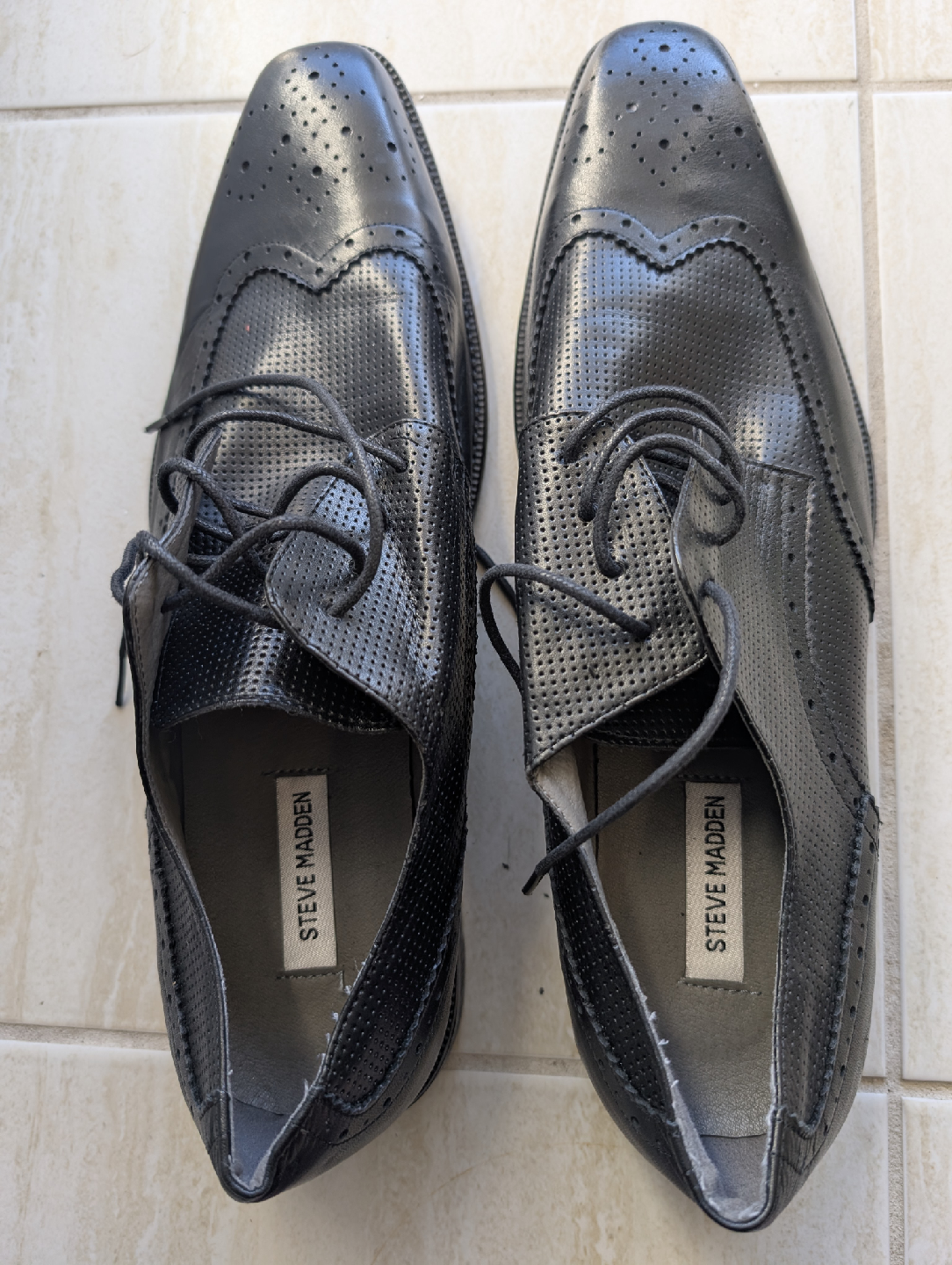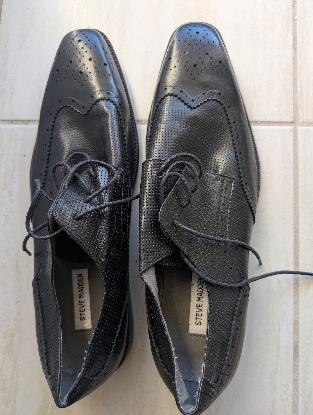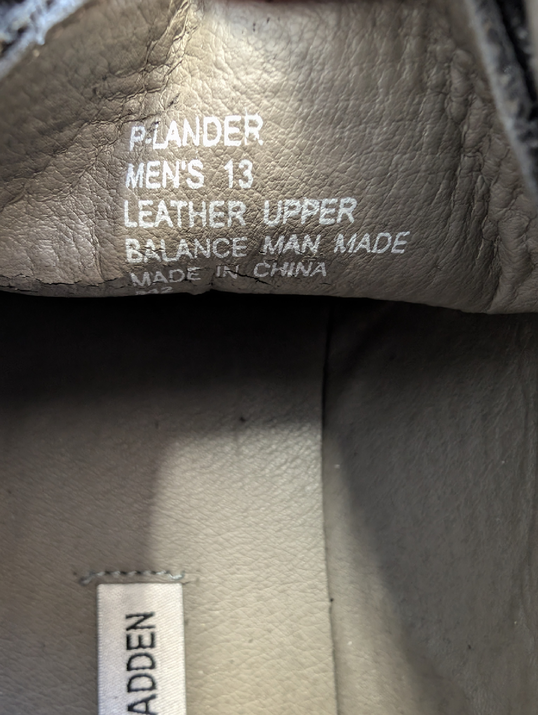 Selling a pair of Steve Madden P-Lander dress shoes in black leather. These are a men's size 13. The upper is leather and the balance is man-made. They're in good condition and ready for a new home!