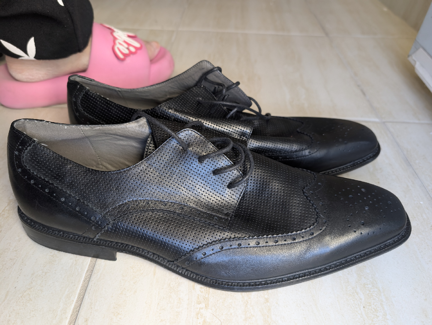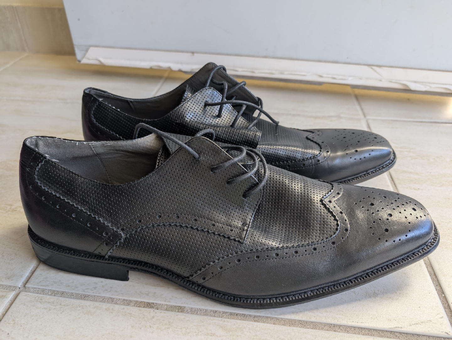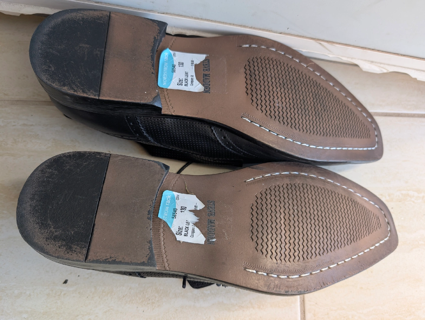 Selling a pair of Steve Madden P-Lander dress shoes in black leather. These are a men's size 13. The upper is leather and the balance is man-made. They're in good condition and ready for a new home!