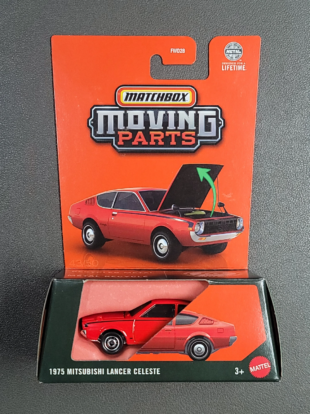 52Selling a Matchbox Moving Parts diecast car! This is the 1975 Mitsubishi Lancer Celeste model. The packaging indicates it's designed for a lifetime, and suitable for ages 3+