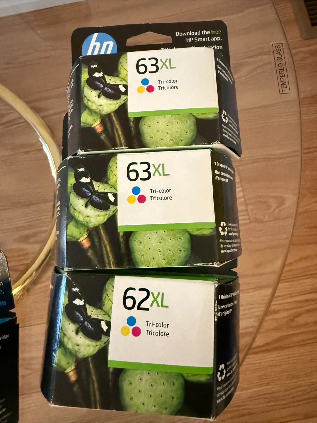 Selling a set of HP ink cartridges. Includes both 63XL and 62XL tri-color cartridges. Perfect for your HP printer! One for 15