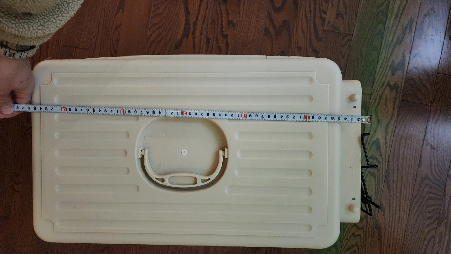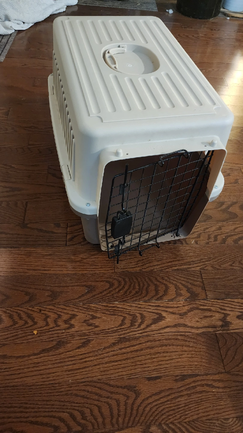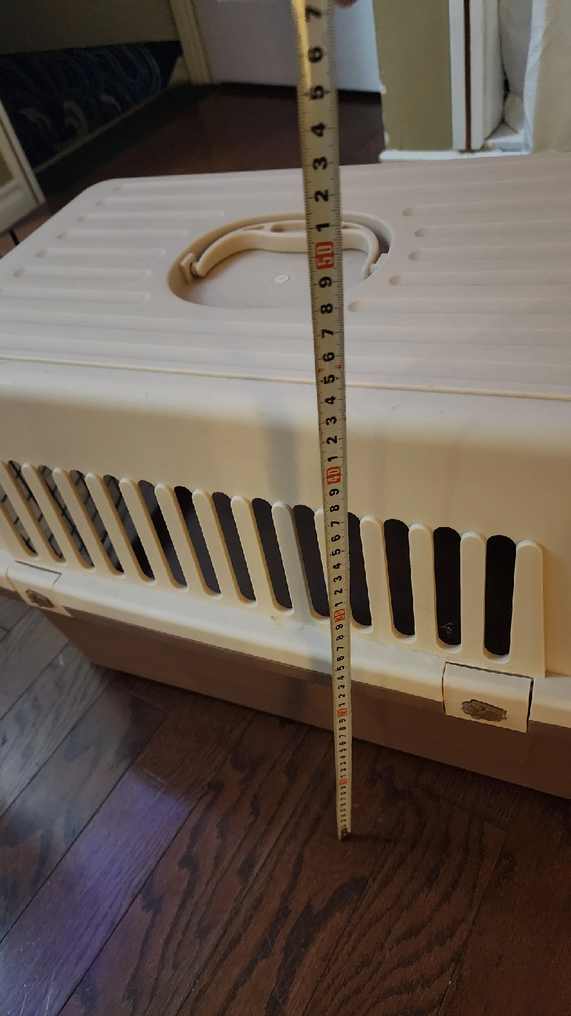 Selling a tan and brown pet carrier. It's in good condition and ready for a new furry friend! The carrier measures approximately 24 inches in length.