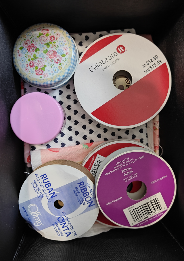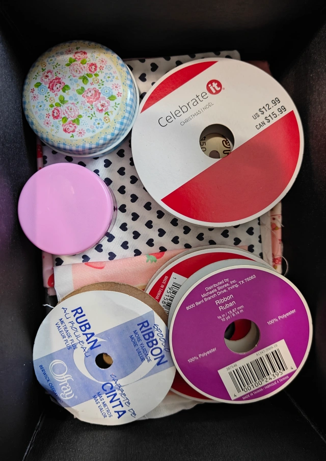 Sewing kit with a variety of fabric pieces, ribbons, and buttons. The kit includes a sewing box with a pink and black pattern, several spools of ribbon (Celebrate It, Offray), and containers of buttons. Great for crafting and sewing projects!