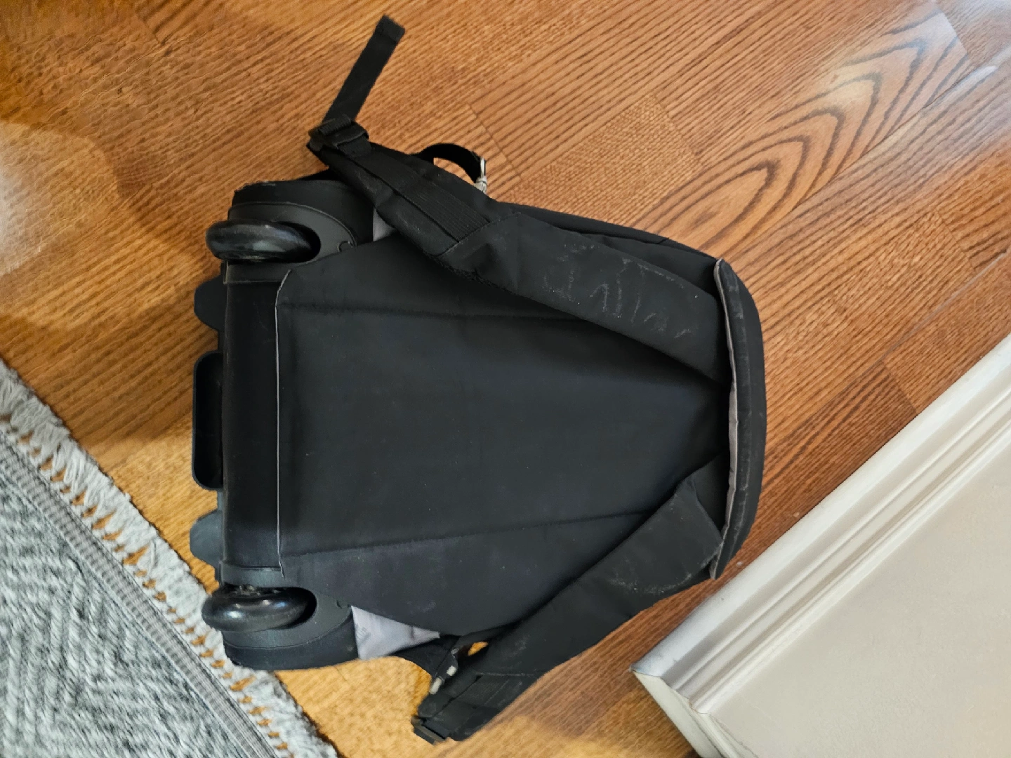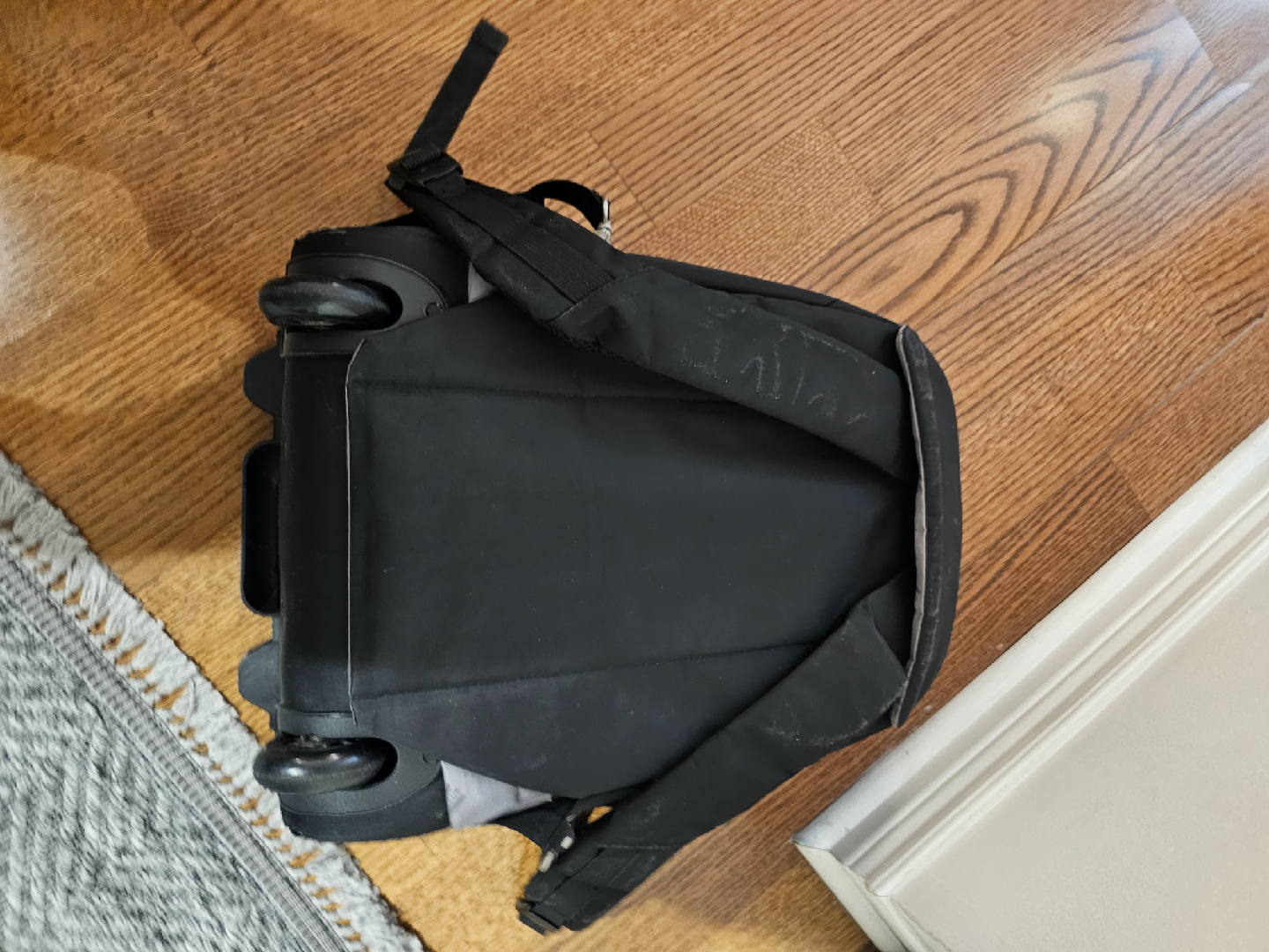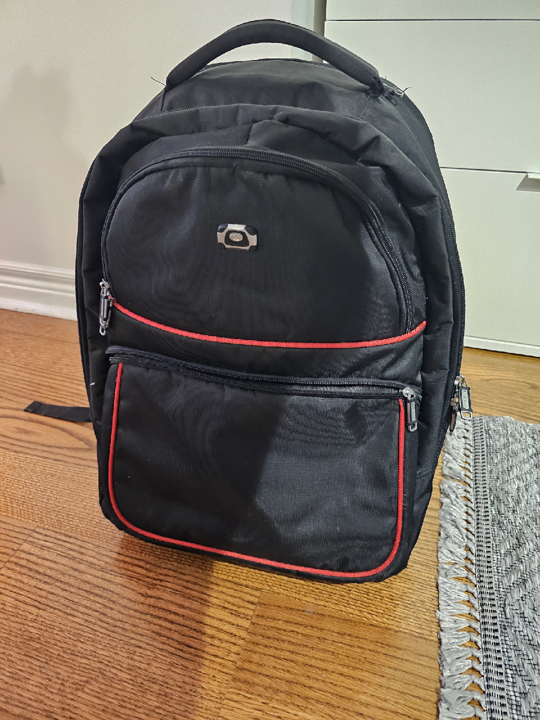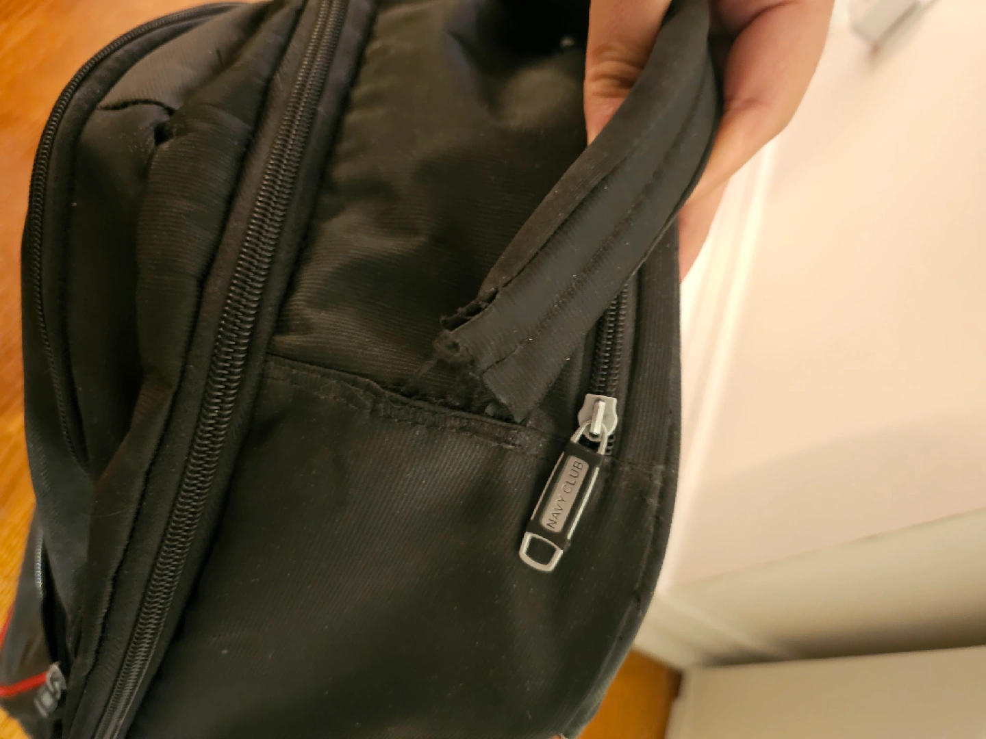 Selling a black rolling backpack from Navy Club. Top handle is coming off, you can see it in the pictures. It's in good condition and perfect for school or travel. It has a retractable handle and wheels for easy transport. It has some wear and tear, but is still very functional.