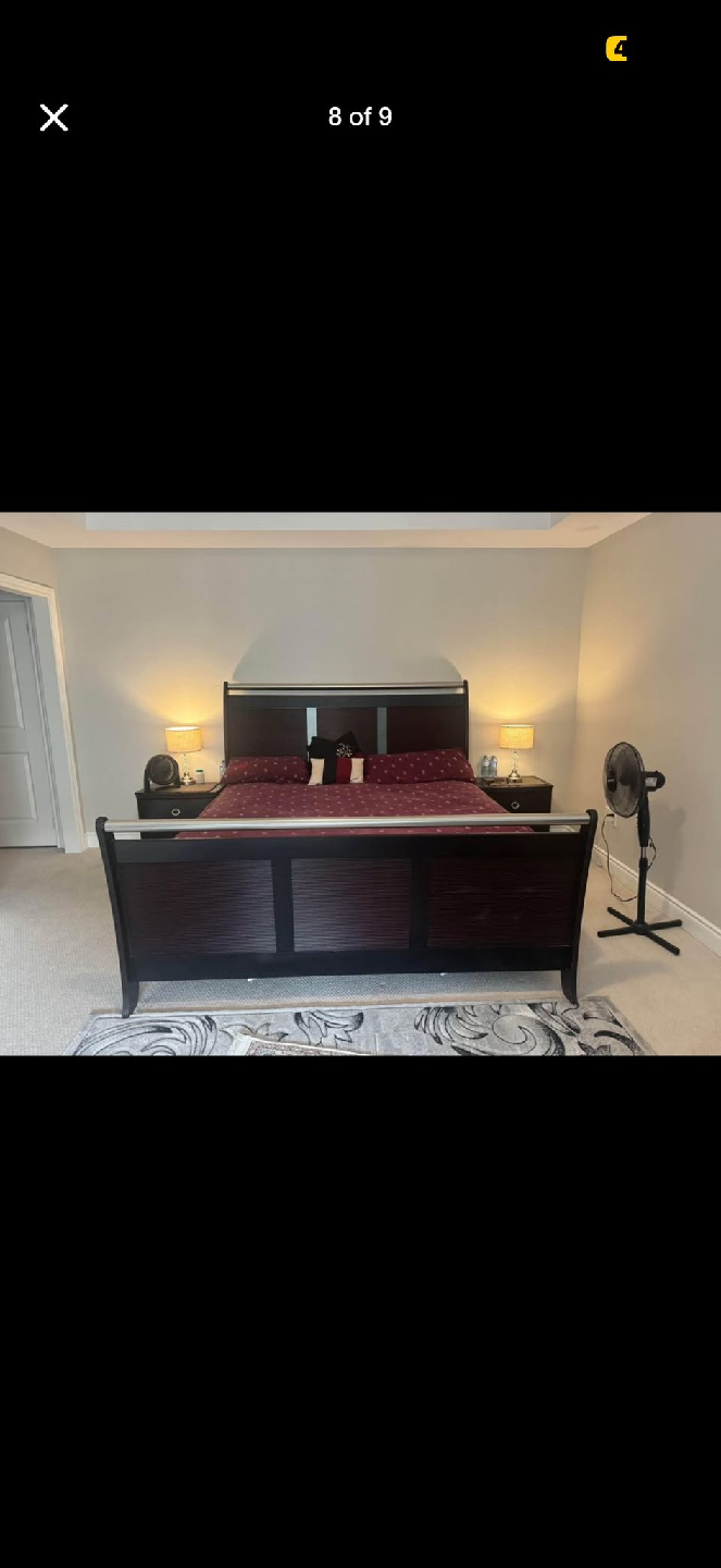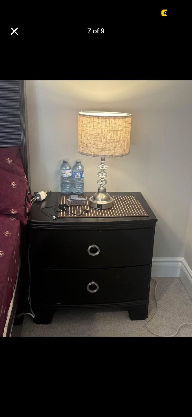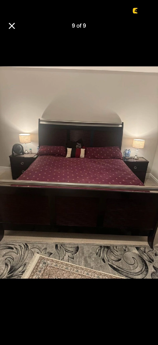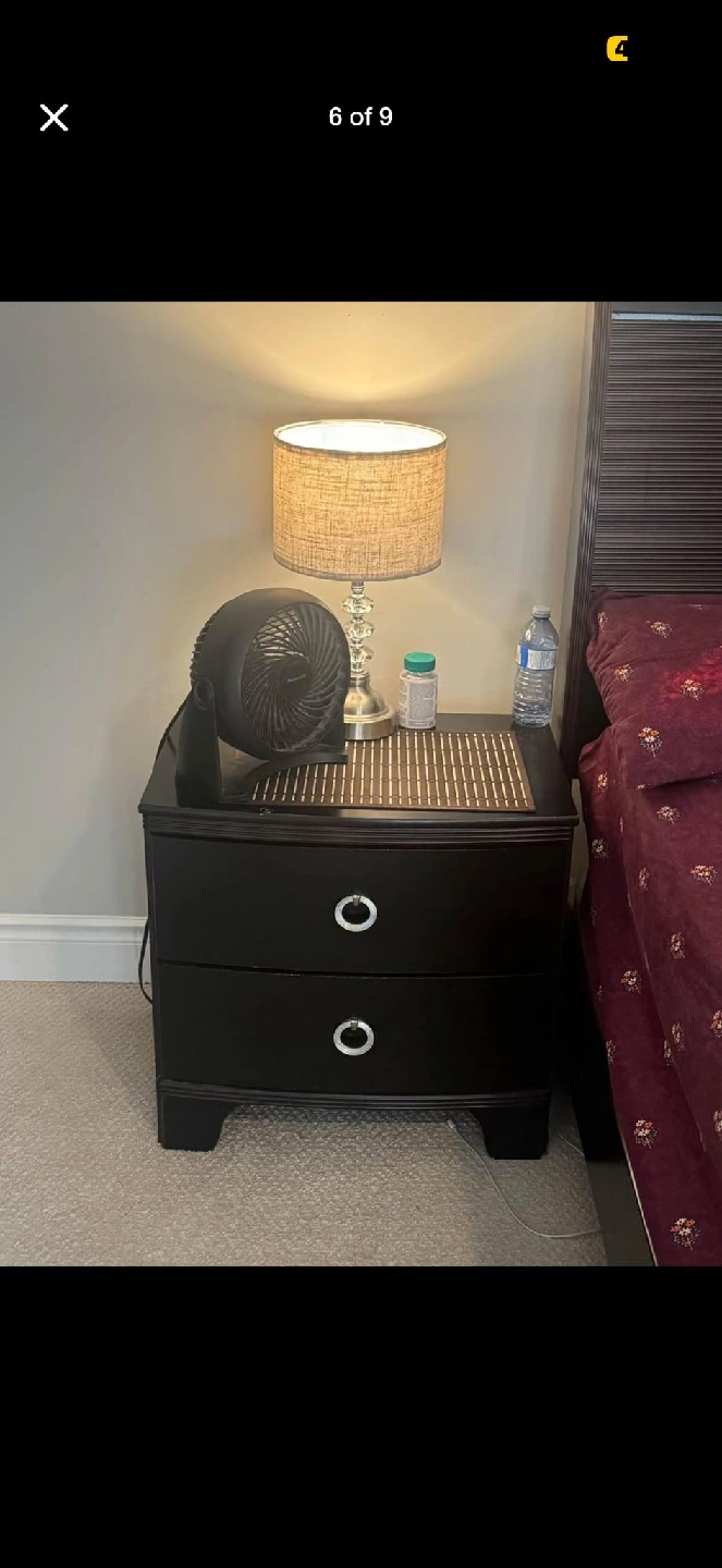The set is in good condition and would be a great addition to any bedroom. The bed frame is a dark wood finish, and the nightstands have two drawers each with silver hardware.