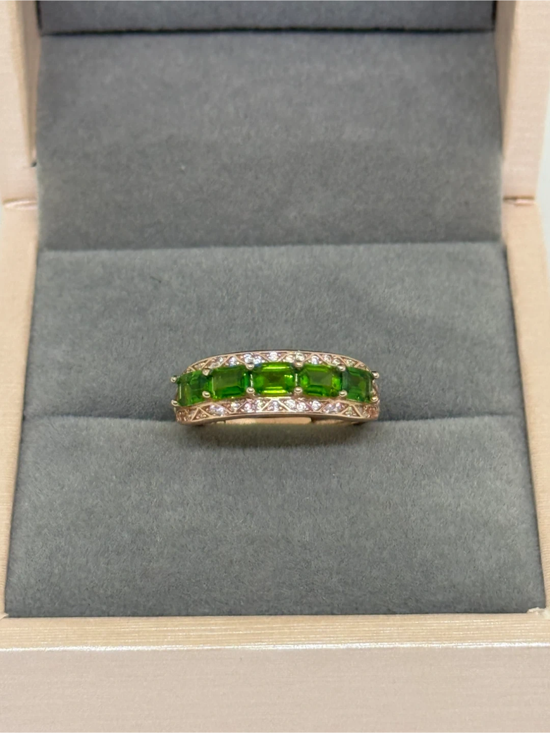 Selling a beautiful ring featuring natural green diopside stones set in rose gold S925 silver. The ring weighs 2.37g. It's a lovely piece that would make a great addition to any jewellery collection! The ring size is adjustable and can fit US size 6 to 8.