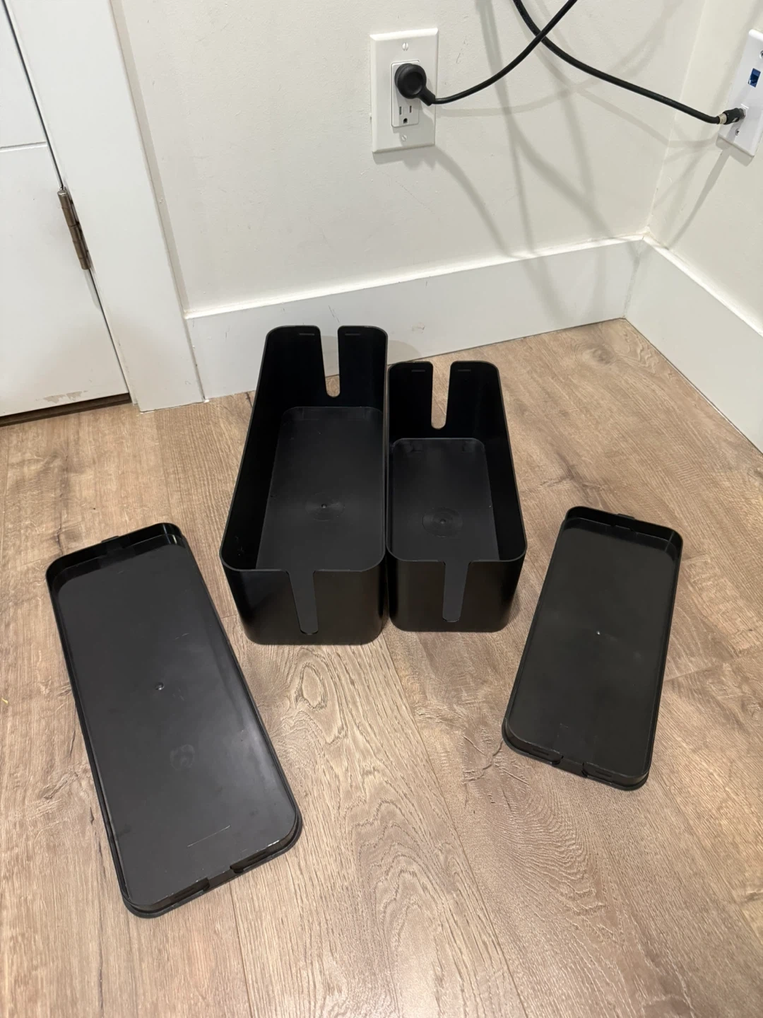 Selling a set of black cable management boxes. These are great for tidying up cords around your desk or entertainment center. Includes two boxes and two lids to keep everything neat and organized