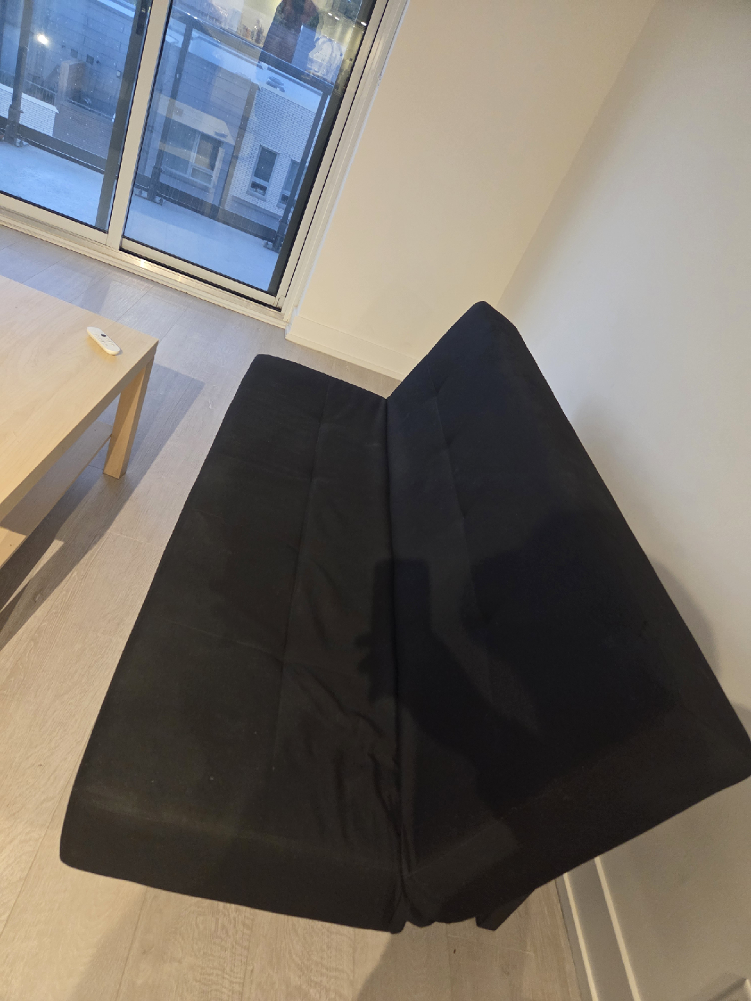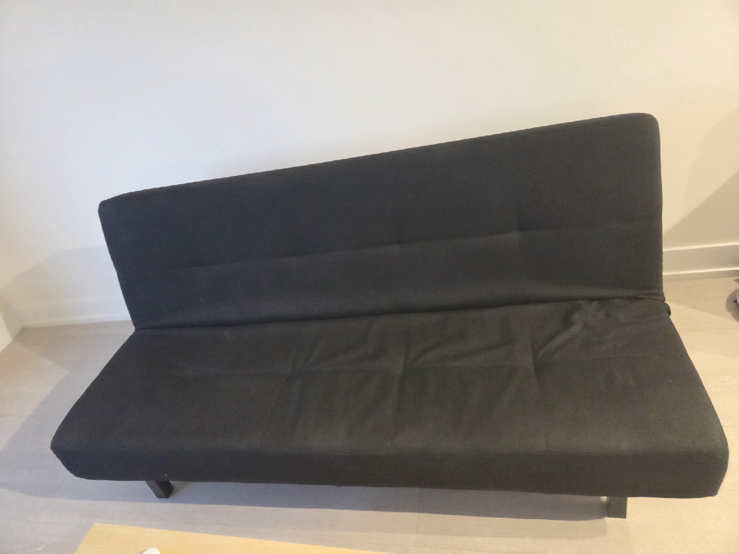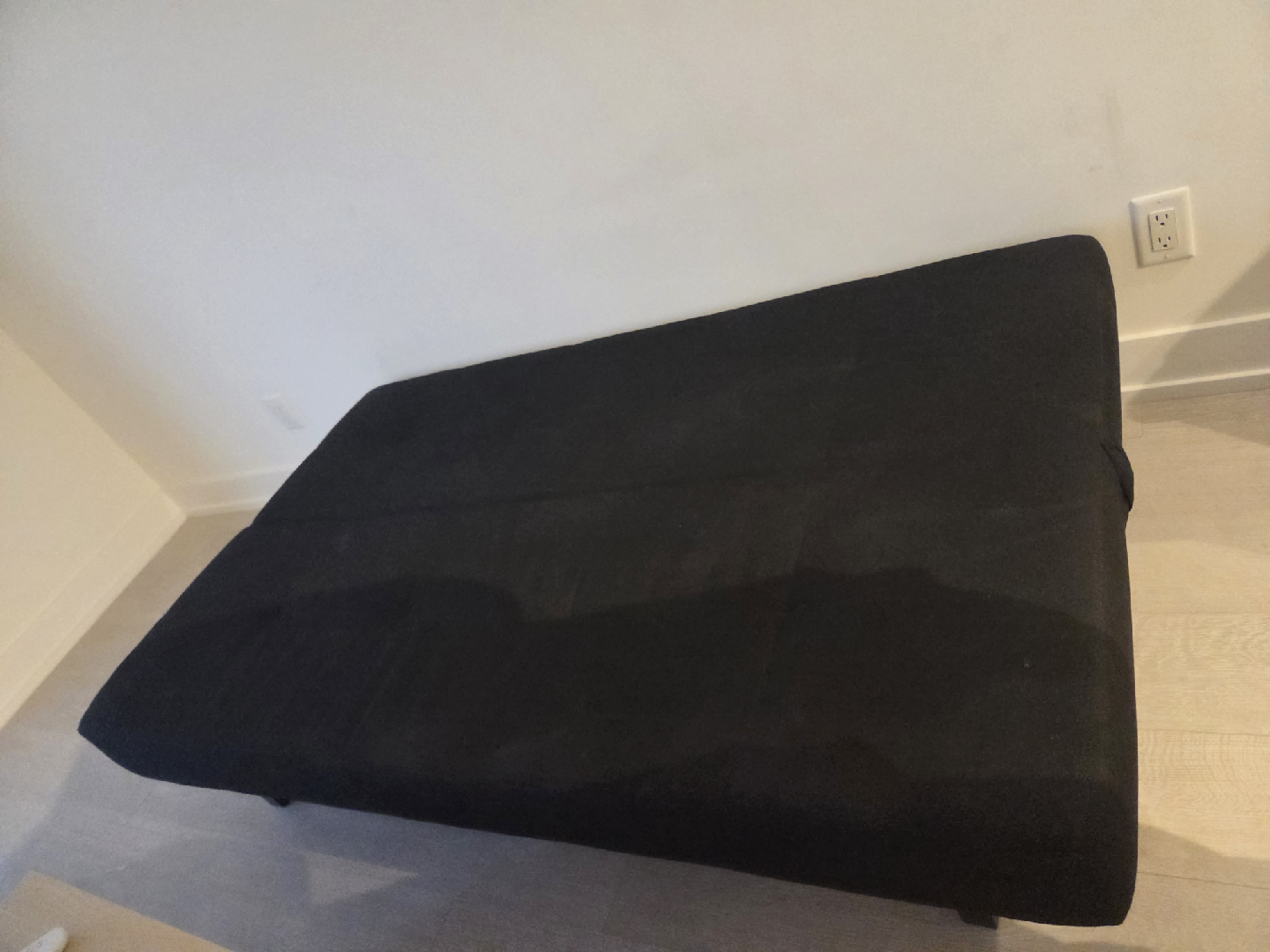 a black futon that can be used as a sofa or folded down into a bed. It's in good condition and perfect for small spaces or a guest room!