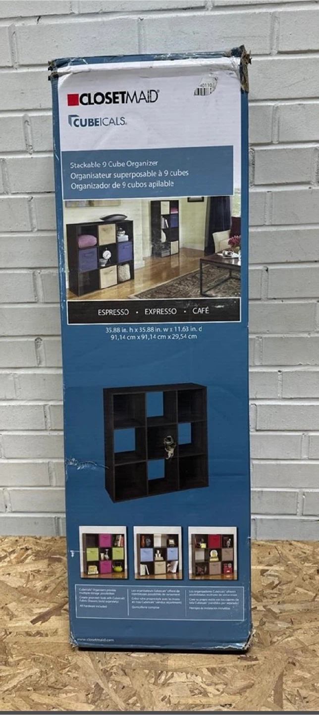 Brand New- still in the box 9-cube organizer shelf in chocolate brown, It's great for adding storage to any room. The dimensions are 35.88 in. H x 35.88 in. W x 11.63 in. D Bought 1 too many, box was opened to verify pieces and parts. Easy assembly. All sales final. Returns only if product is not as described. Pick up only Weekdays and Weekends, flexible hours for pickup