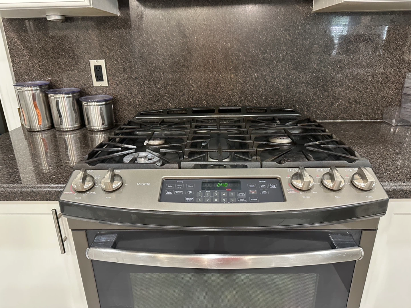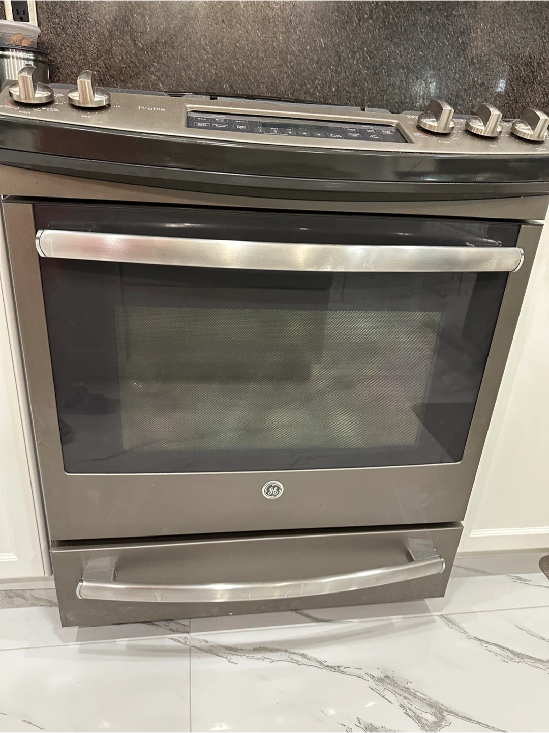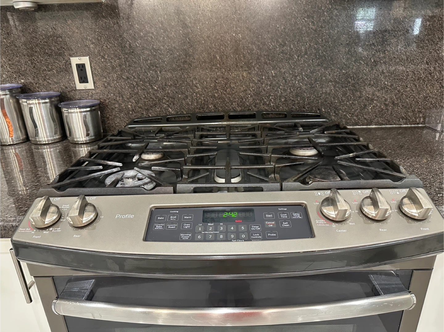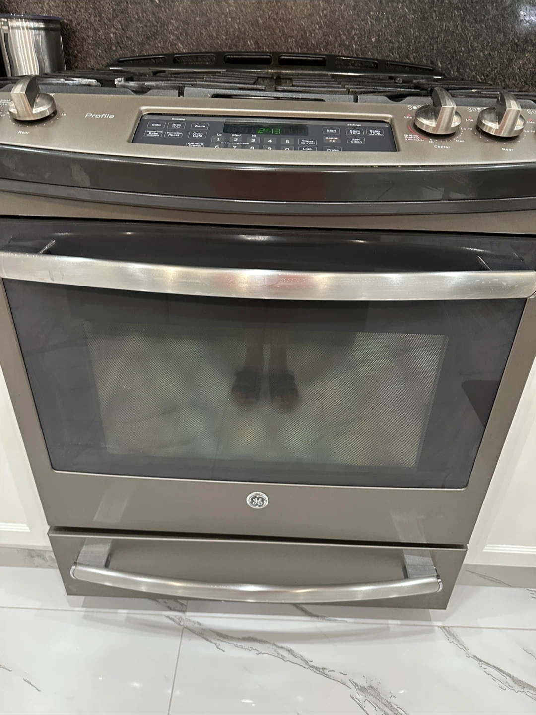 Selling a GE Profile gas range in stainless steel. It's in excellent working condition and ready for a new home. The range features a sleek design and offers precise temperature control for all your cooking needs. It has a spacious oven and a cooktop with multiple burners.