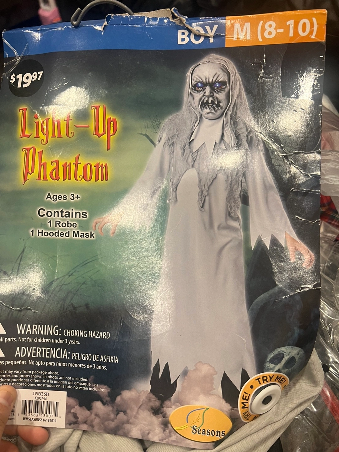 Get ready for Halloween with this Light-Up Phantom costume! It's a boy's size M (8-10) and includes a robe and a hooded mask. The packaging says it's for ages 3+ and originally cost $19.97. A fun and spooky outfit for your little one!