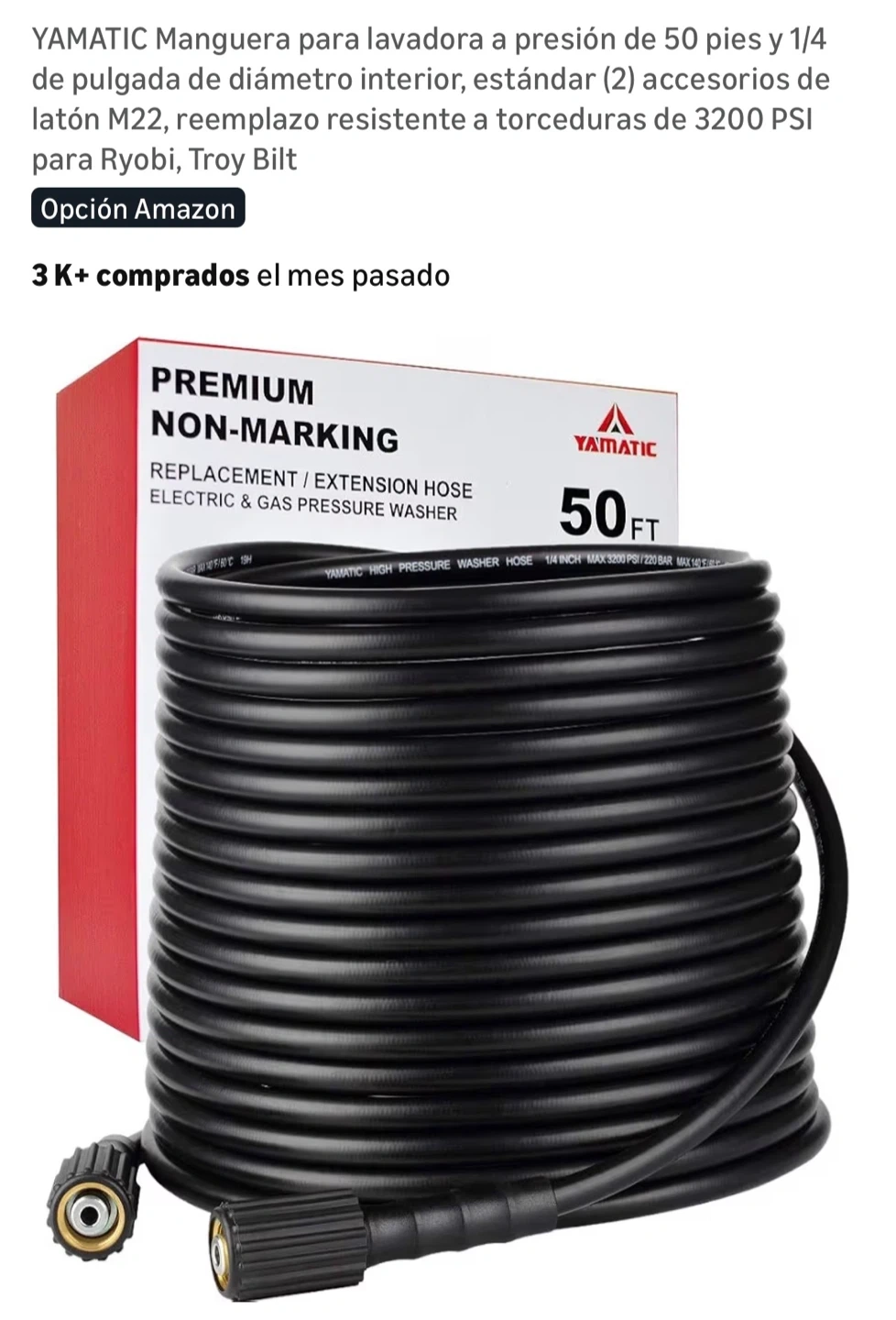 60I'm selling a YAMATIC 50 FT pressure washer hose. It is a premium non-marking replacement/extension hose for electric & gas pressure washers. It's designed to handle high water pressure safely with M22 fittings and a 1/4 ID YAMATIC Pressure Washer Gun with Foam Cannon for Car Wash, 4000 PSI Short Nozzle with 3/8 Inch Swivel Quick Connect and M22 Adapter Replacement for Craftsman, YAMATIC Manguera para lavadora a presión de 50 pies y 1/4 de pulgada de diámetro interior, estándar (2) accesorios de latón M22, reemplazo resistente a torceduras de 3200 PSI para Ryobi, Troy Bilt YAMATIC Pistola de lavado a presión con cañón de espuma para lavado de autos, pistola corta de 4000 PSI con conexión rápida giratoria de 3/8 pulgadas y reemplazo del adaptador M22 para Craftsman,