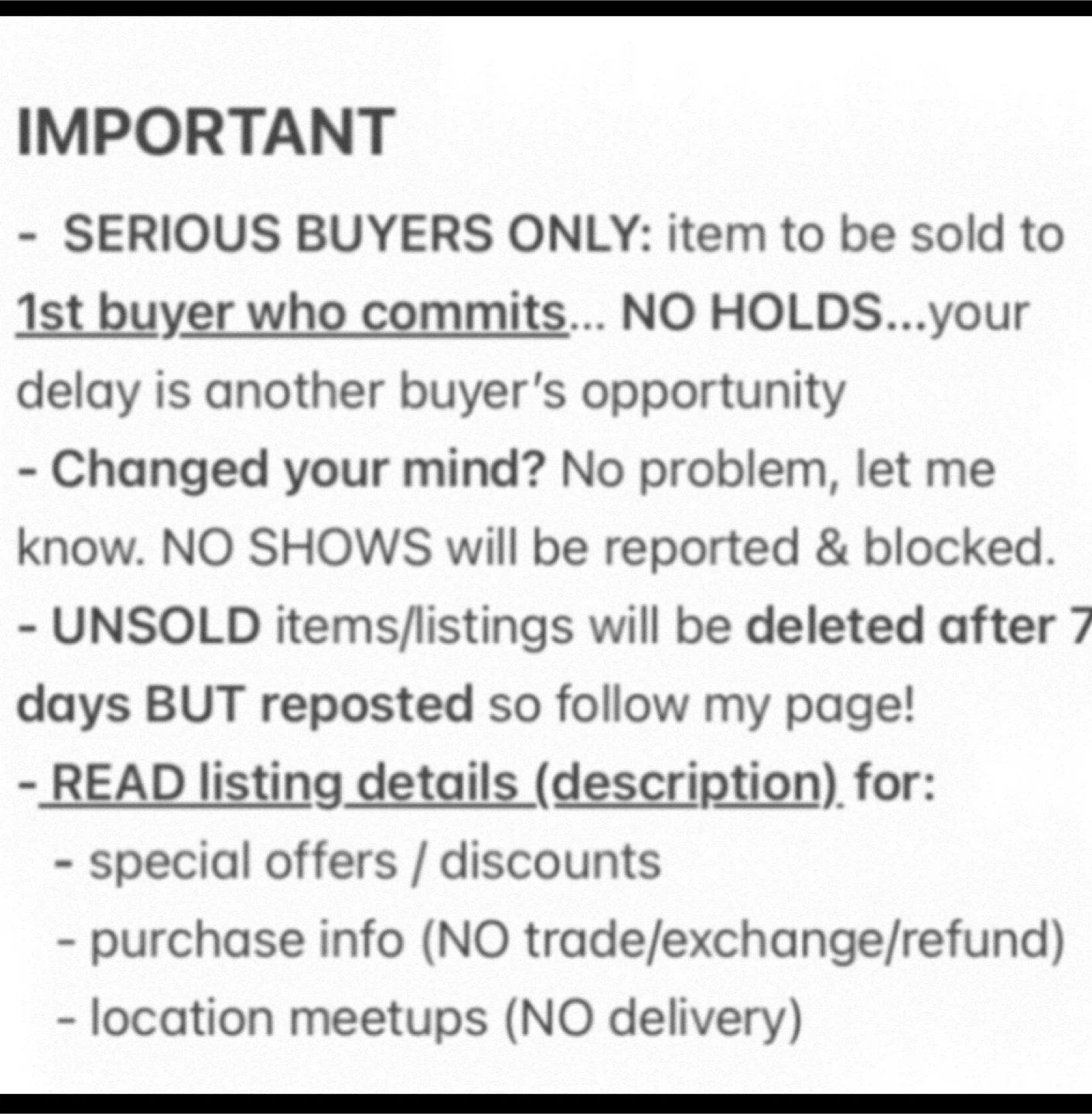 SERIOUS BUYERS ONLY / FINAL SALE / Cash Payment at pickup / NO HOLDS (Items will be sold on a FIRST-COME/PAYMENT-FIRST-SERVE basis!)