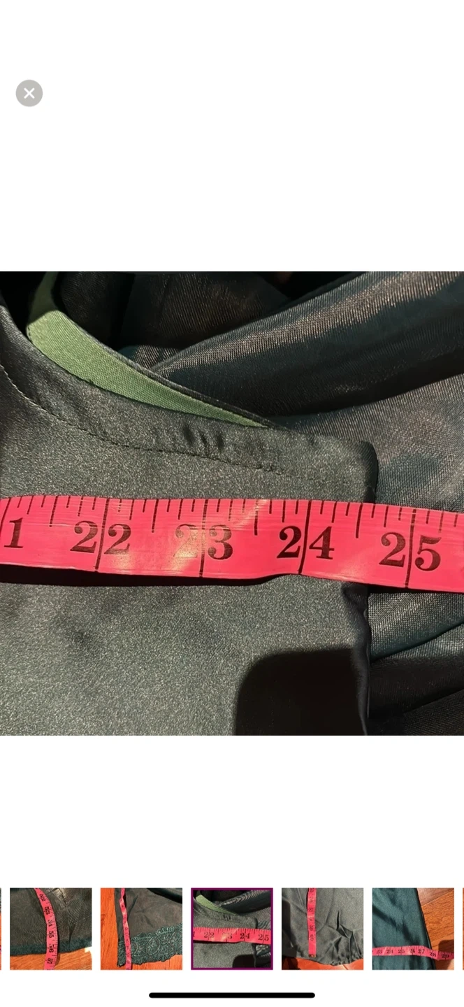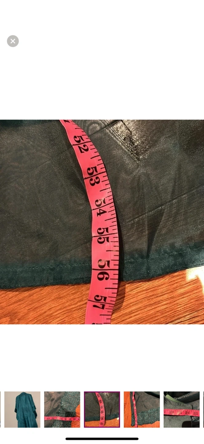 75Selling a beautiful luxury rich aunty vibes teal green caftan! It features lovely lace detailing on the sleeves. Based on the measuring tape in the pictures, the size appears to be around 36 inches. It's in great condition and ready for a new home
