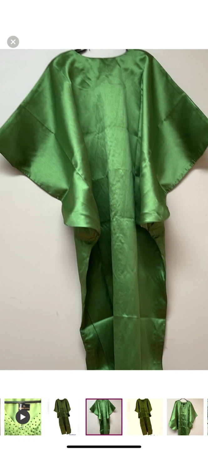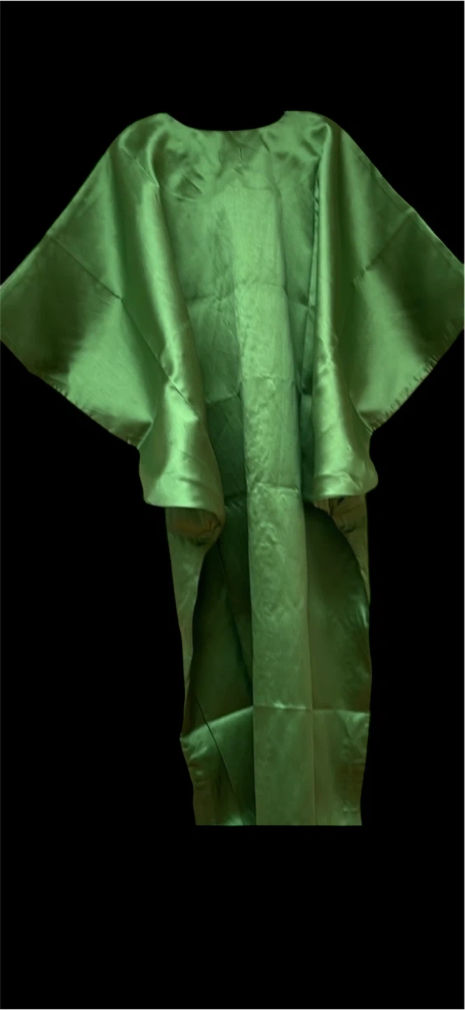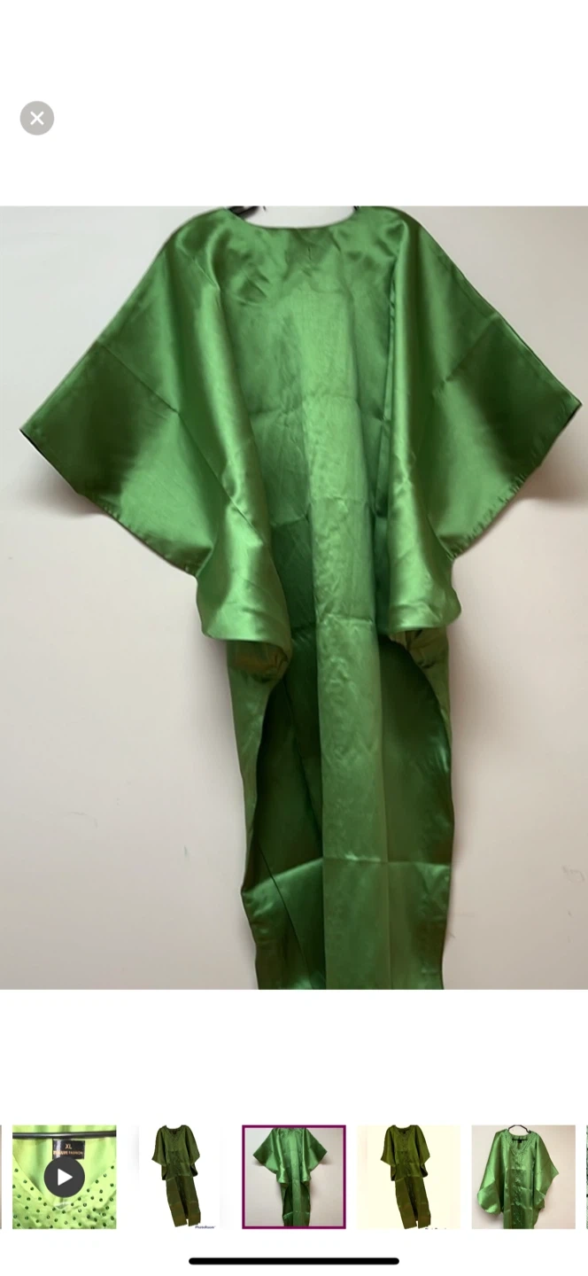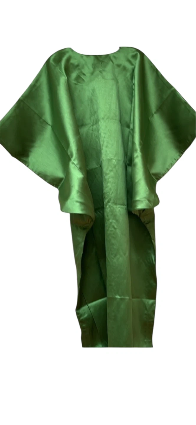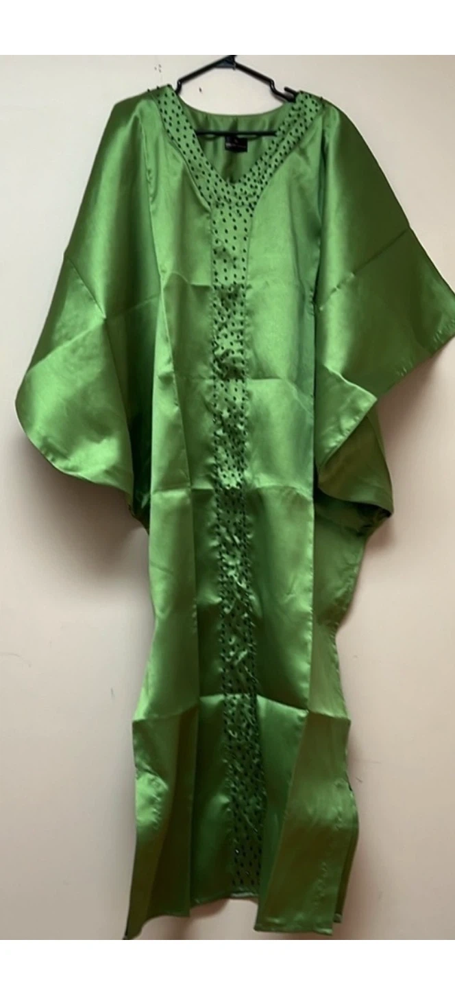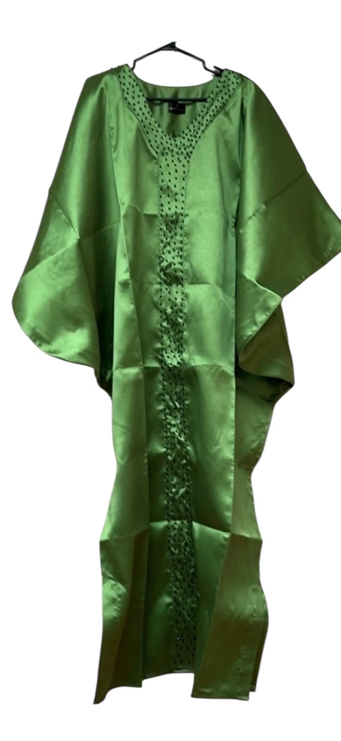 75Selling a beautiful green satin kaftan dress. The dress is made of a lightweight material and features decorative embellishments along the front. It's perfect for lounging or a night out