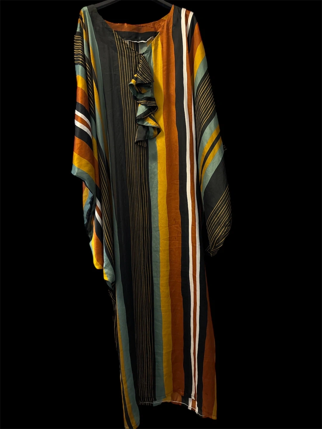 75Stylish and comfortable striped kaftan dress! This one-size-fits-most dress features a unique striped pattern in shades of black, yellow, orange, green and white. Perfect for lounging or dressing up for a casual outing!