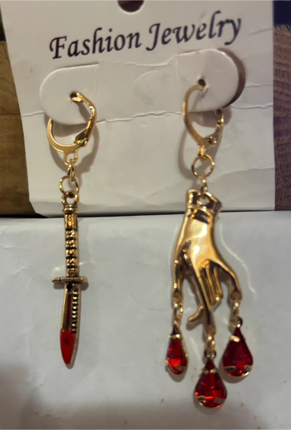 Unique and eye-catching earrings! One is a sword design with red accents, and the other is a hand with dangling red jewels. Perfect for adding a bold touch to any outfit