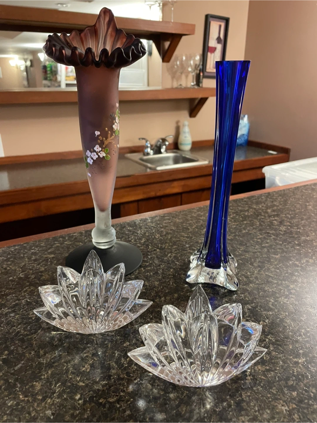 Selling a collection of vases and heavy crystal candleholders. They are in good condition and would look great in any home. Perfect for adding a touch of elegance to your space. Super unique painted and stained vase.