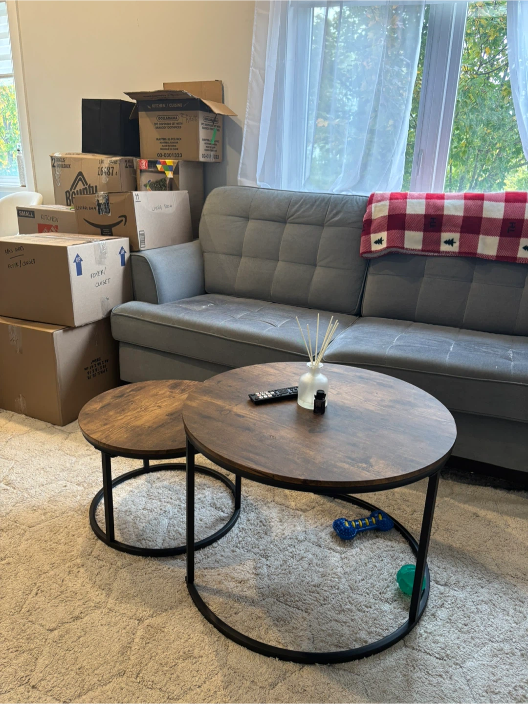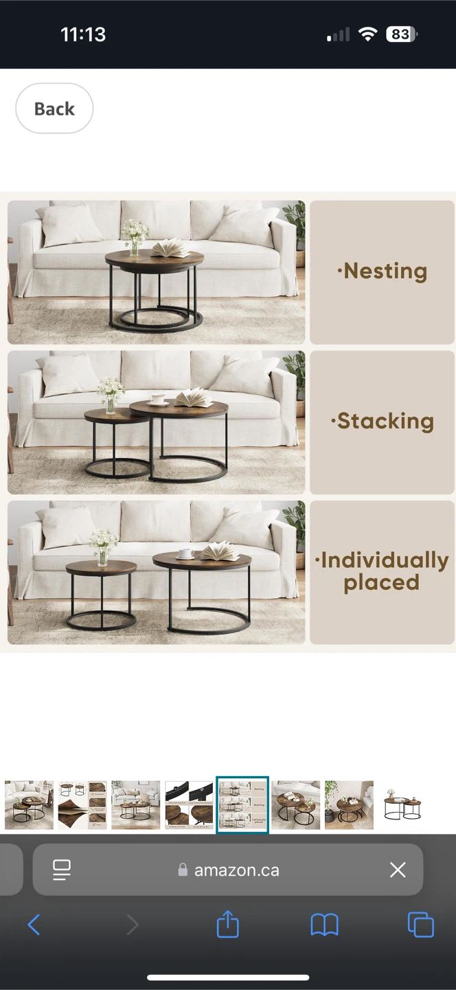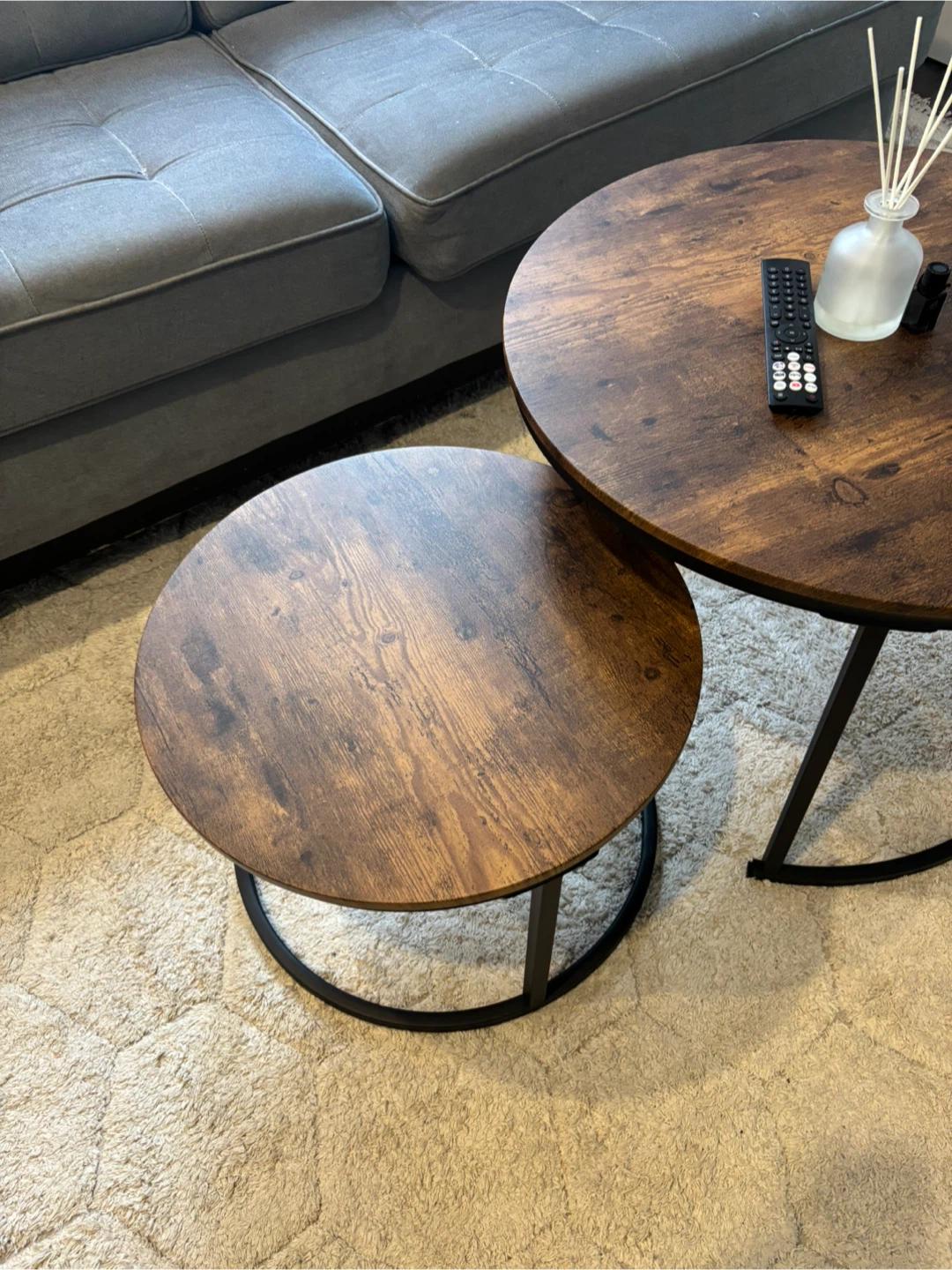 Selling a set of Smukee nesting coffee tables with a rustic wood top. These tables are great as end tables in a living room, bedroom, or balcony.