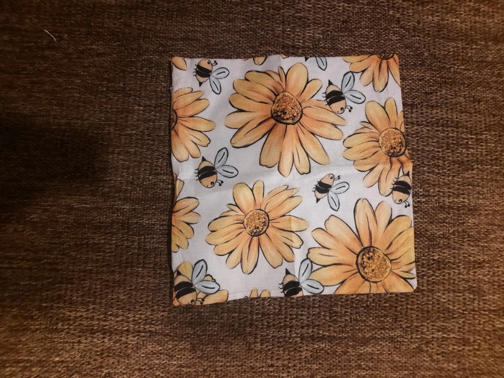 140A square piece of fabric featuring a cheerful floral and bee pattern. The fabric appears to be in good condition and would be perfect for a variety of craft projects or to add a touch of spring to your home