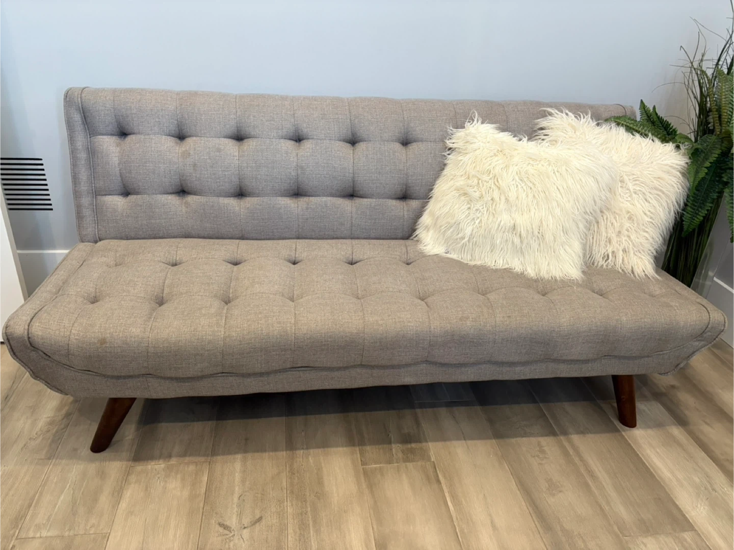 Selling a comfy grey tufted couch! It's in great shape and perfect for a living room or guest room. The couch has a stylish, modern look with its tufted design and wooden legs.