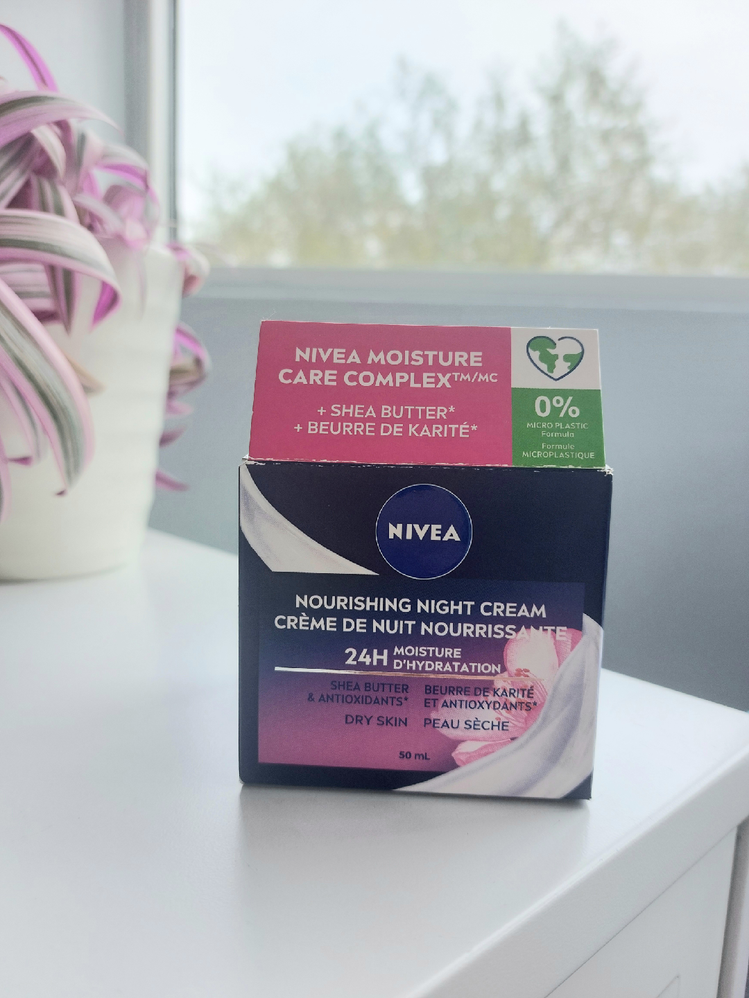 Brand new Nivea Nourishing Night Cream for dry skin. This cream contains shea butter and antioxidants, and is dermatologically tested. It's a lightweight, non-greasy formula that intensively moisturizes up to 24 hours. It comes in a 50ml jar.
