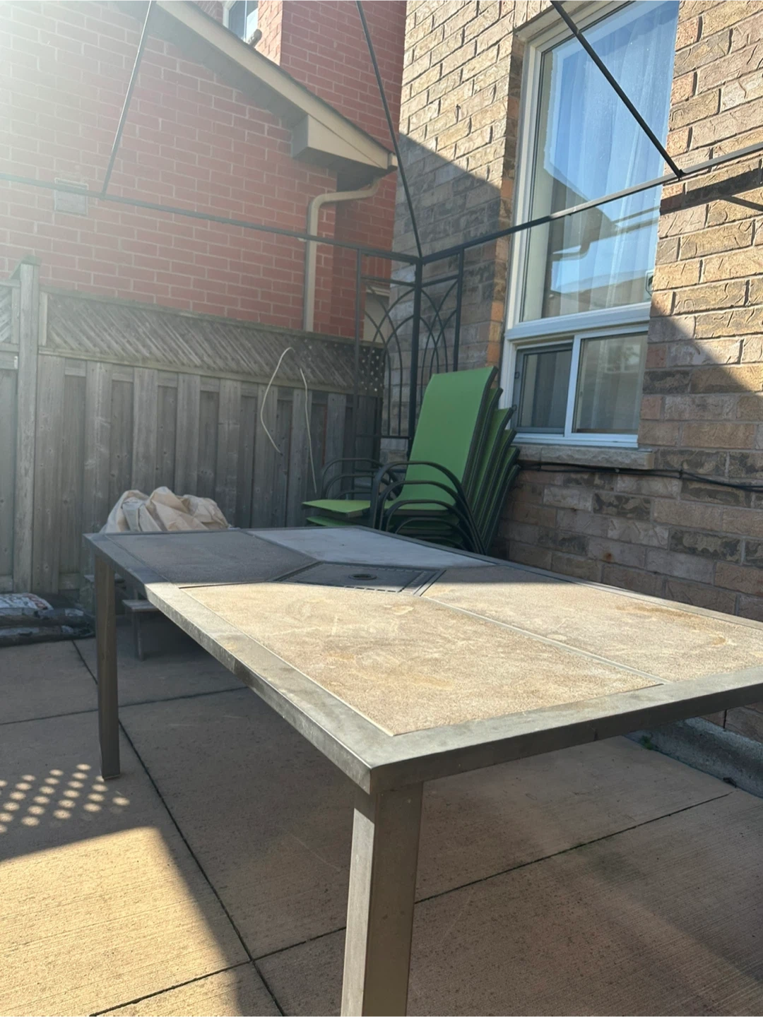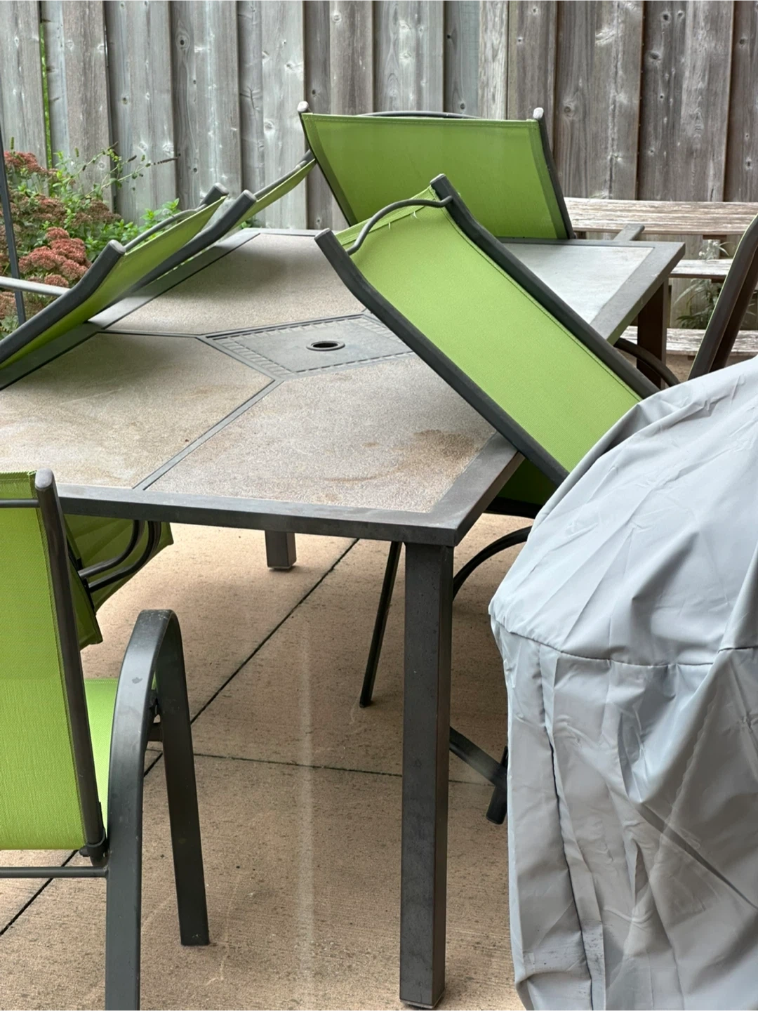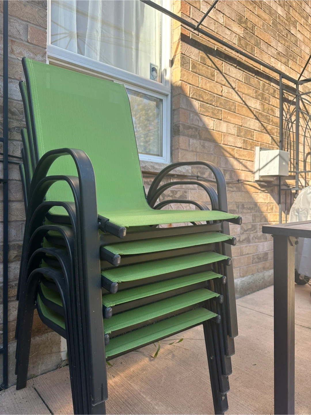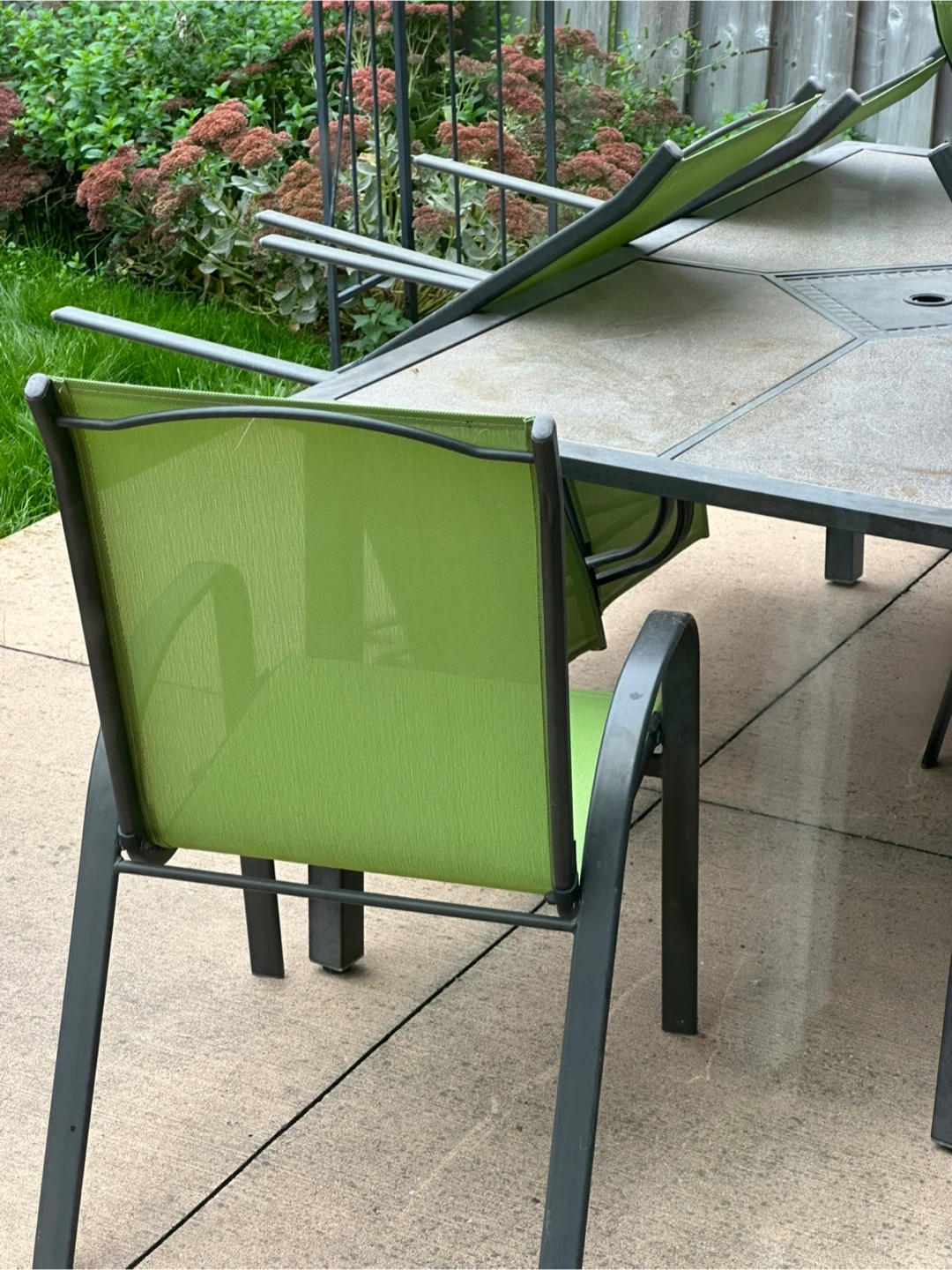 Selling a patio table with six chairs! The chairs are a nice bright green color. It's a great set for outdoor dining and enjoying the weather