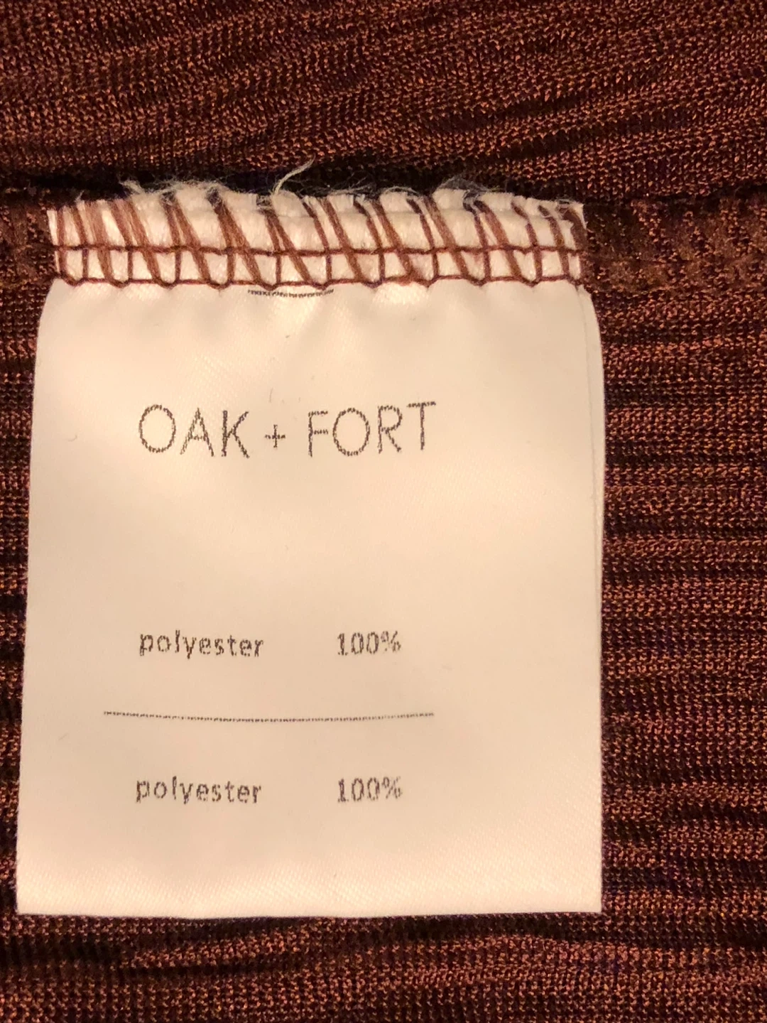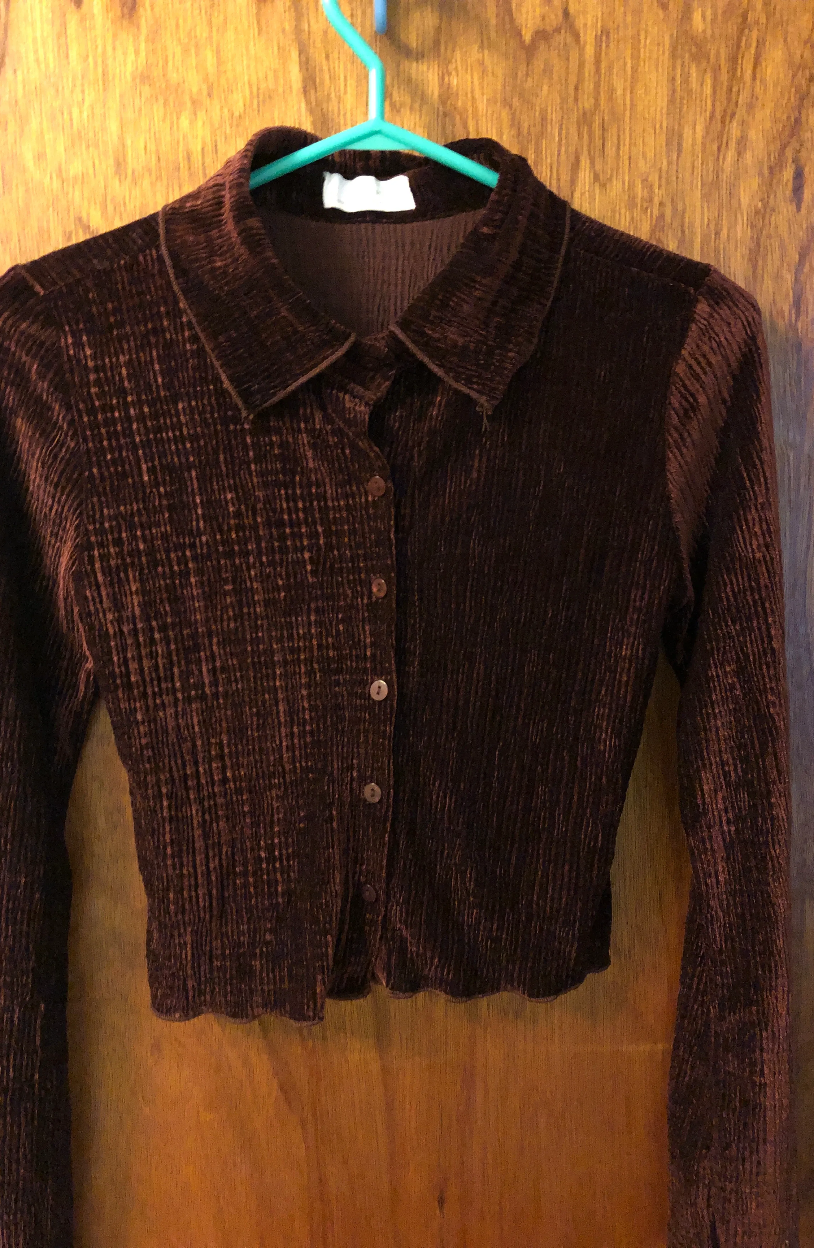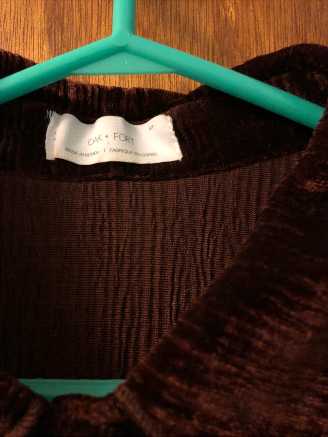 Here's a super cute Oak + Fort long-sleeve top! It's made of 100% polyester with a unique crushed velvet texture. The colour is a rich brown, perfect for fall or winter. It's in great condition and ready for a new home