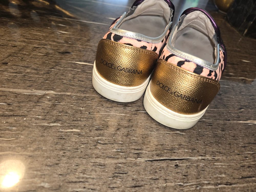 205Selling a pair of Dolce & Gabbana slip-on sneakers! They feature a unique design with black lace on the front, pink leopard print on the sides, and gold accents on the back. These are made in Italy and are a real statement piece for your wardrobe