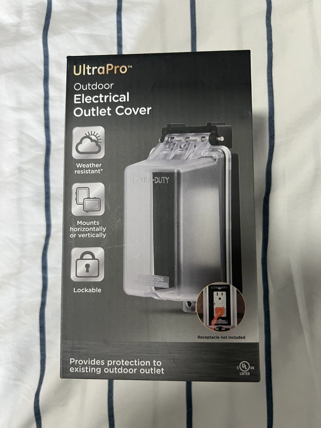 Selling a brand new UltraPro outdoor electrical outlet cover, still in its original box! It's weather resistant and can be mounted horizontally or vertically. It's also lockable to prevent unauthorized use and provides protection to existing outdoor outlets