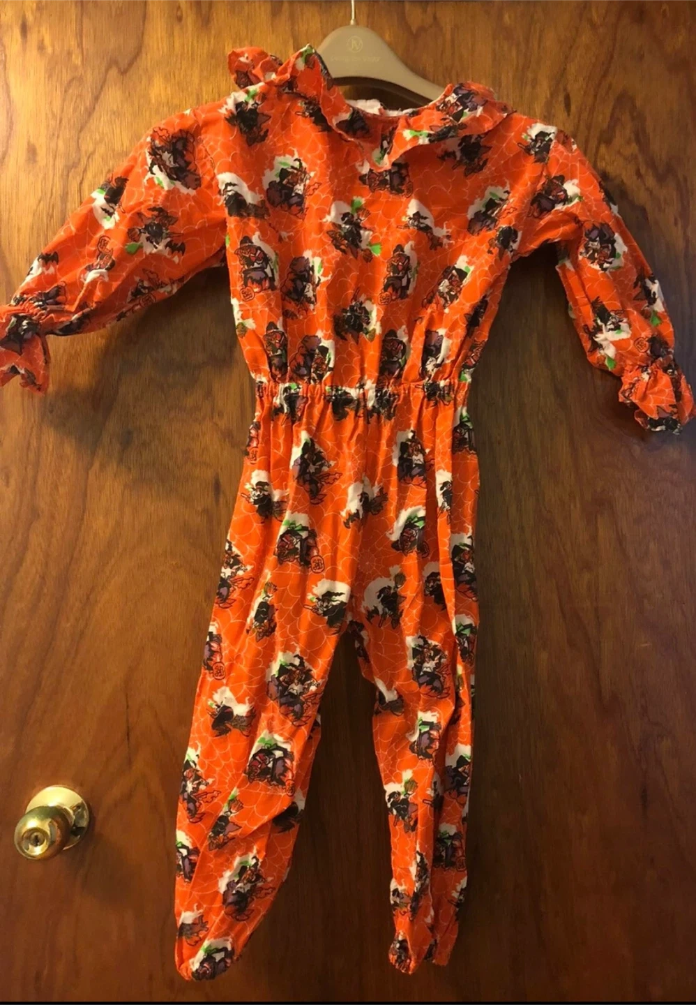 Super cute Halloween witch costume, perfect for your little one! It's size 2T and features a fun witch and spiderweb pattern on an orange background. Great for dress-up or Halloween night!