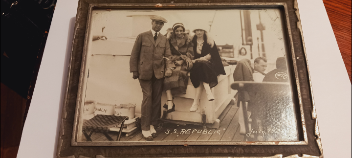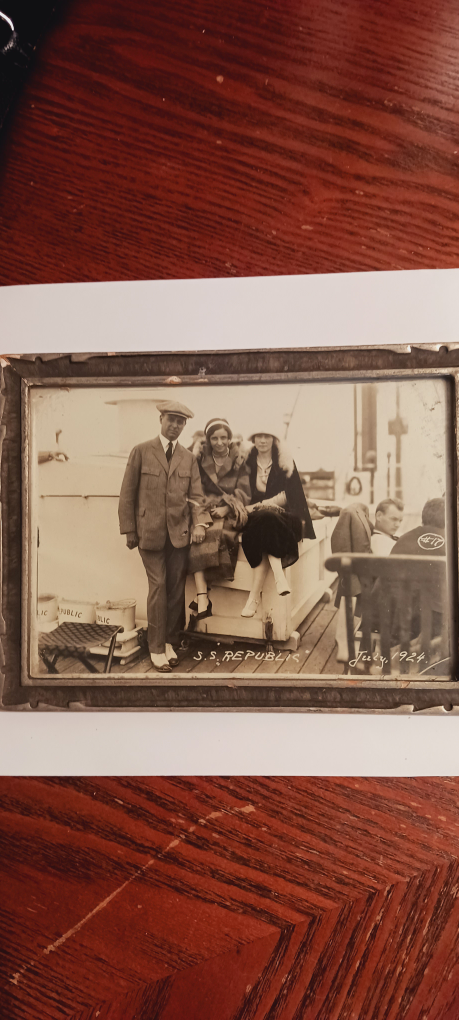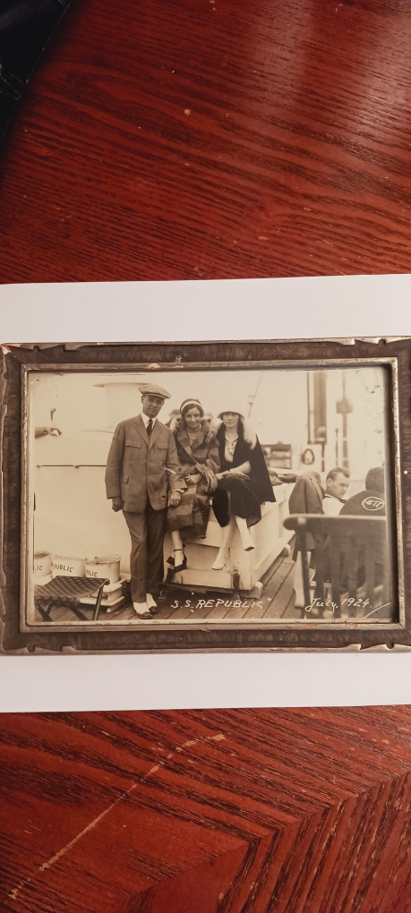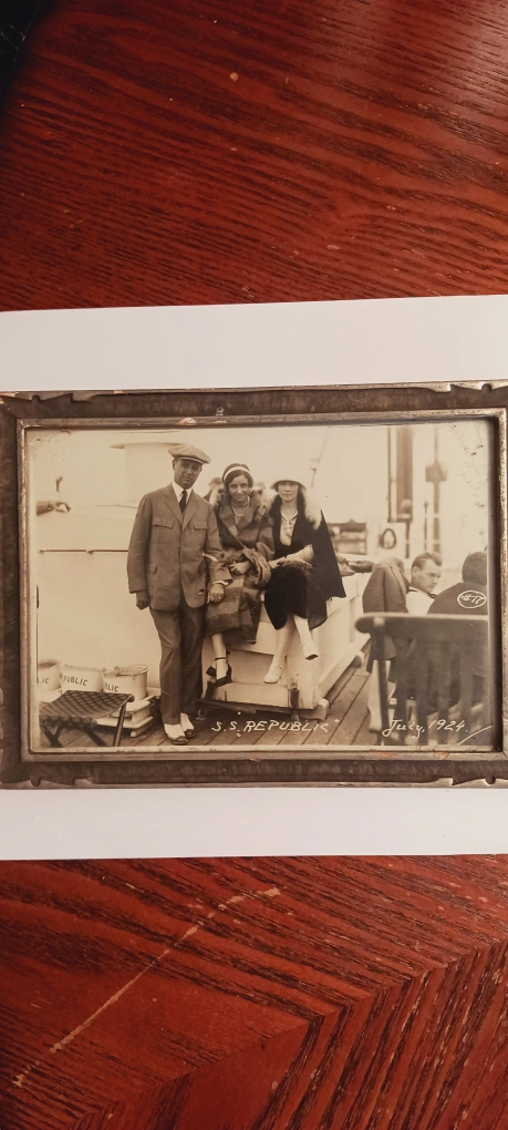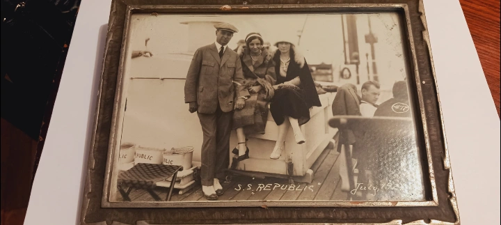 Antique Collectible 1924. July" S.S. REPUBLIC " Ship framed photograph that captures a moment in time aboard the S.S. Republic in July 1924. The Photograph depicts family of Howard Story Sr. Johanna Story & Eleanor Story. ( These names are written on the back ). It's a charming piece of history, perfect for collectors or anyone who appreciates antique photography. 8"×6". ALL MY PRICES ARE NEGOTIABLE !!!