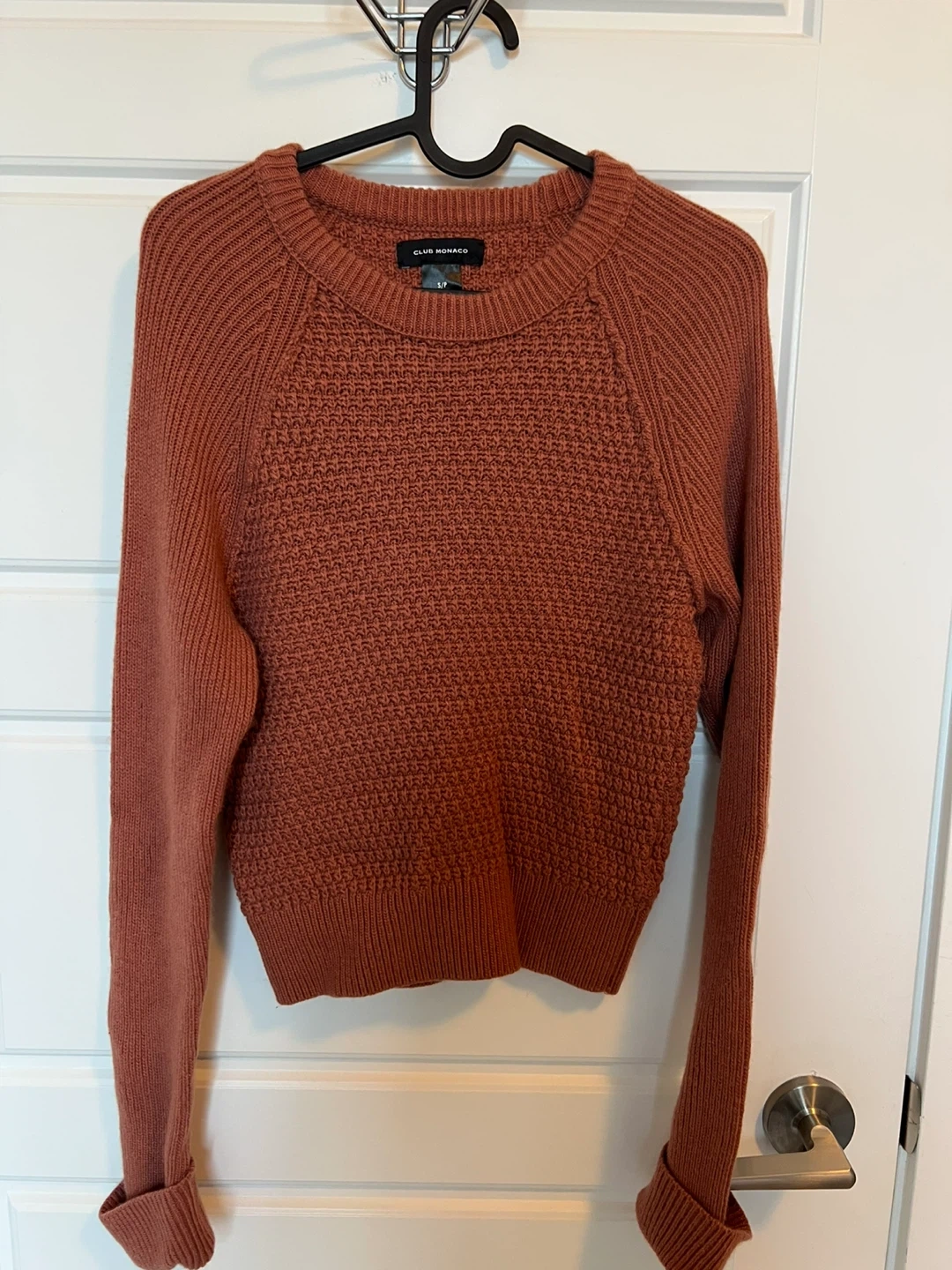 Cozy Club Monaco knit sweater in a lovely terracotta colour! It's a size small and in great condition. Perfect for layering or wearing on its own during cooler weather.