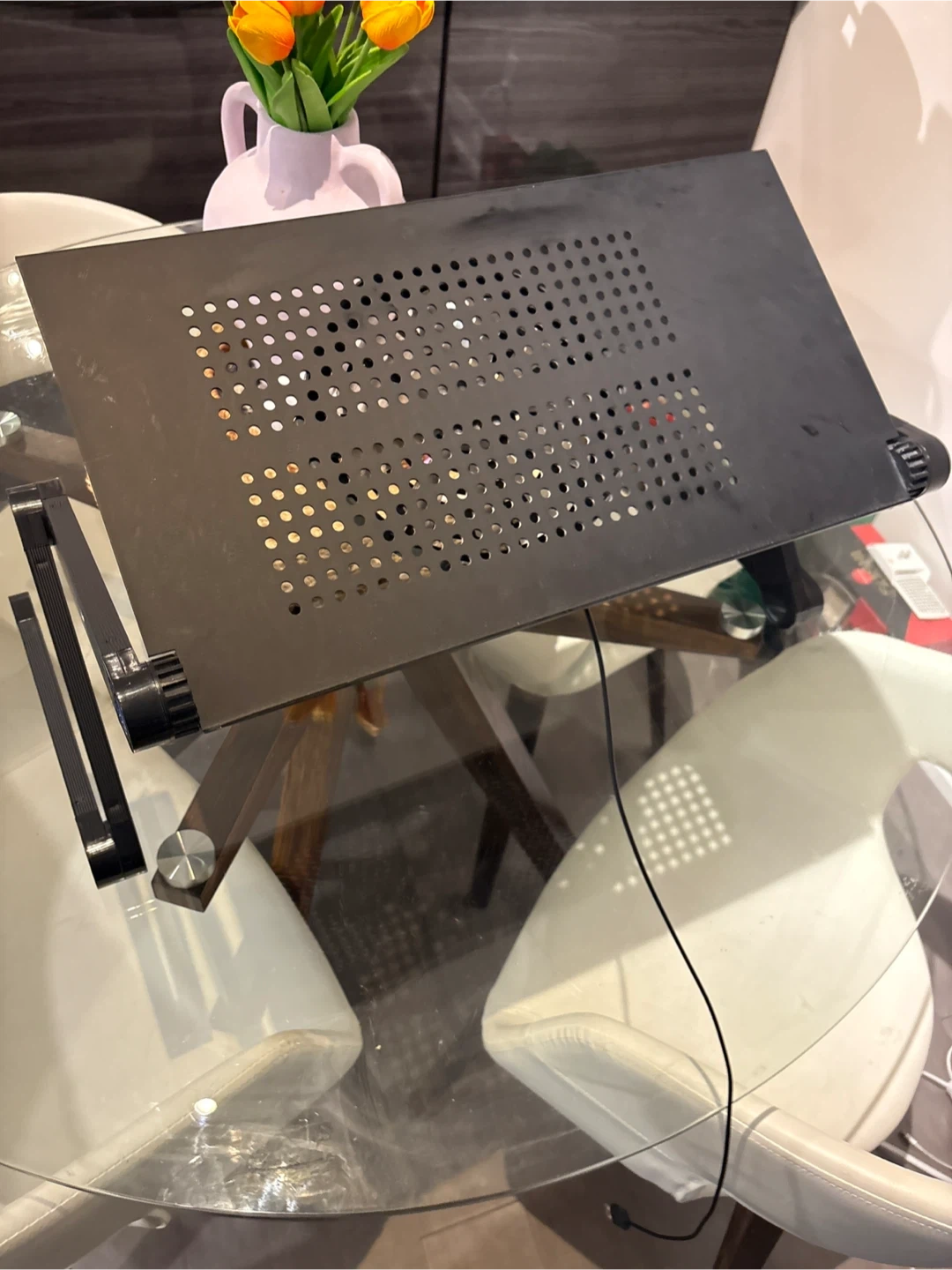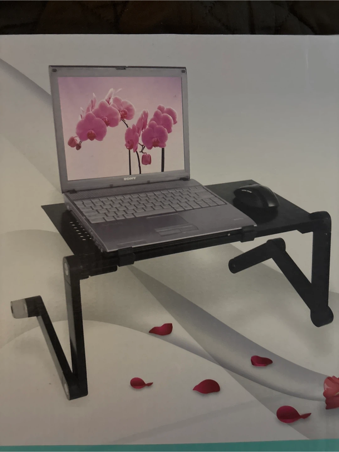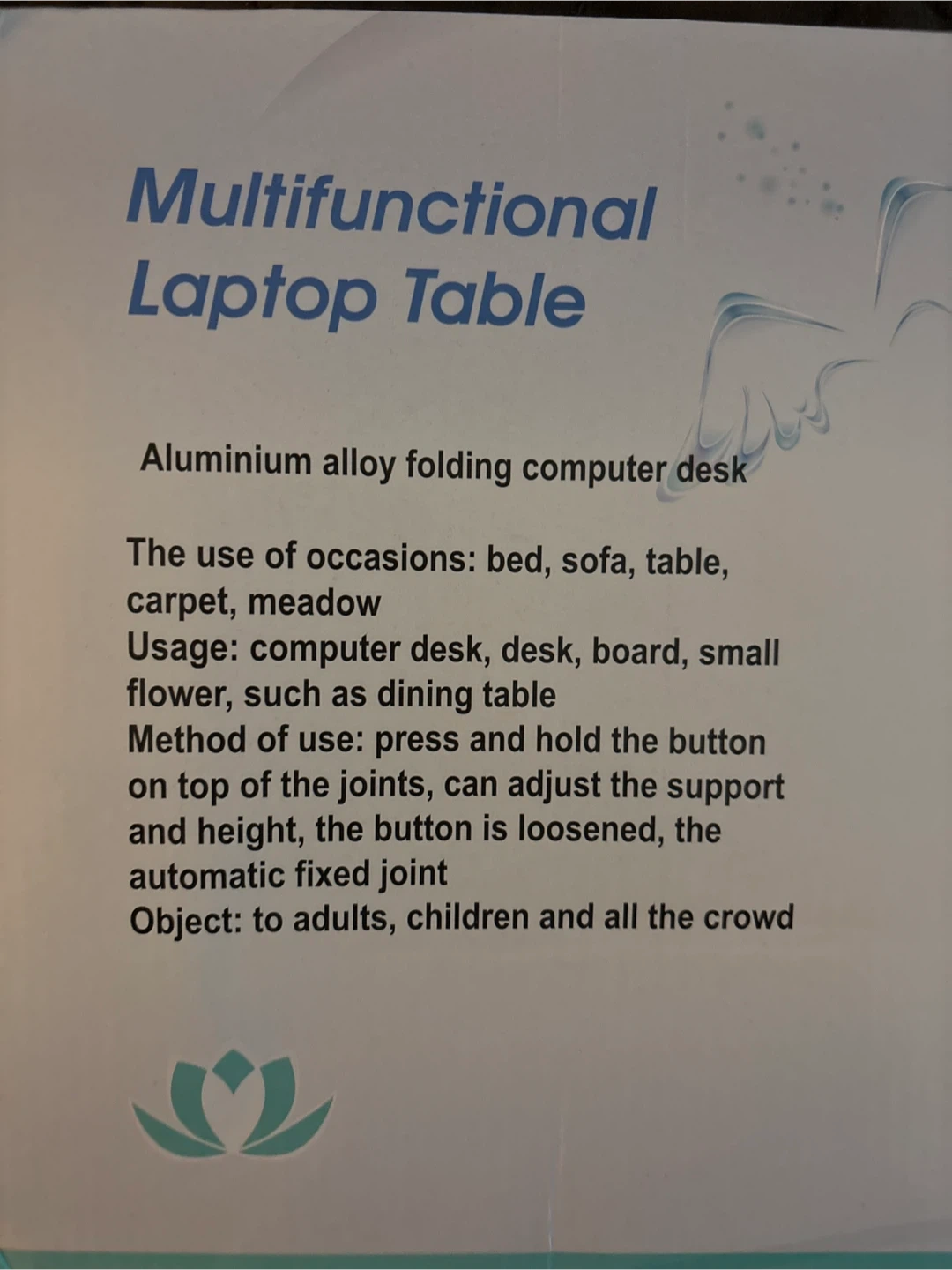 Selling a multifunctional laptop table. It's an aluminum alloy folding computer desk that's perfect for use in bed, on the sofa, or even on the carpet or meadow! You can use it as a computer desk, board, or even a small flower dining table. Just press and hold the button on top of the joints to adjust the support and height, then loosen the button to fix the joint automatically. Suitable for adults and children alike