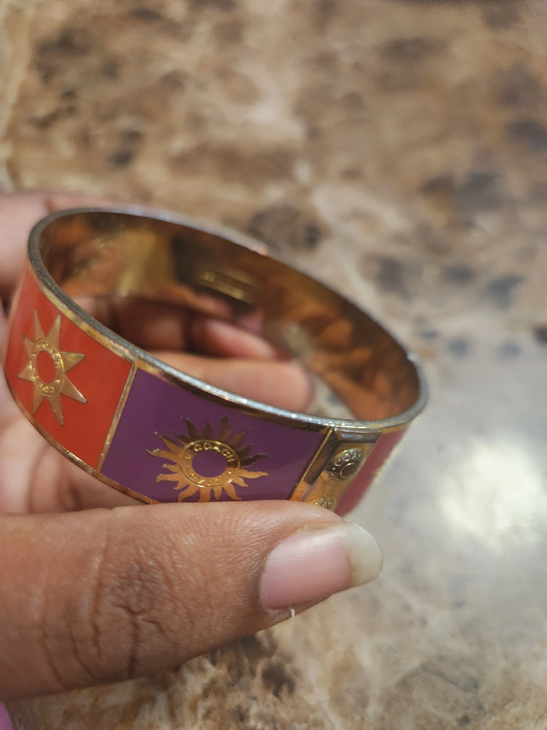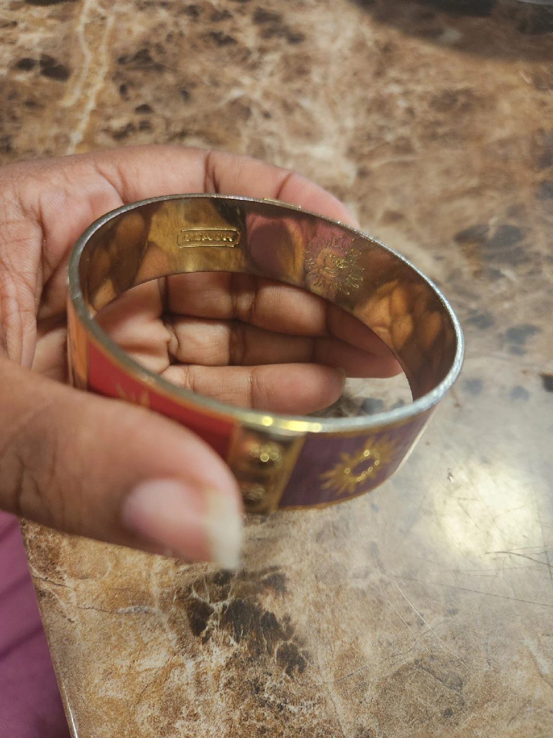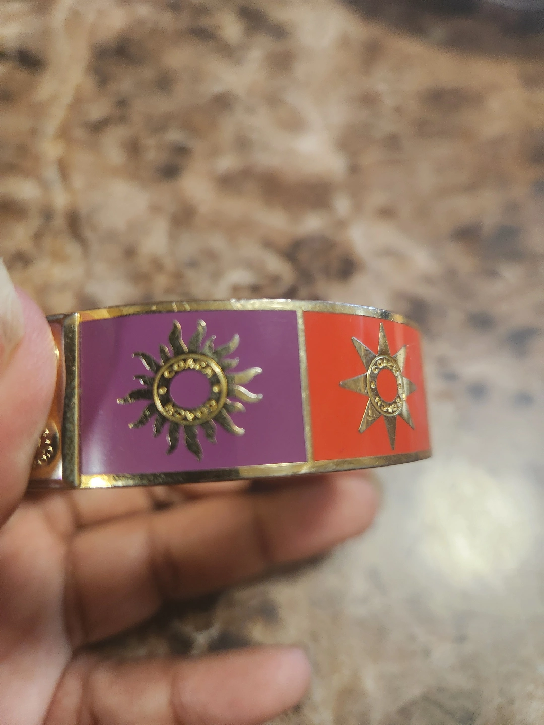This is a stylish Coach bangle bracelet featuring a vibrant design with purple and red blocks, each adorned with sun-like starbursts. It's in good condition and ready to add a pop of colour to your outfit! price is firm plz. pick up midland and Danforth or 401 bay street or stc mall or Kennedy stn