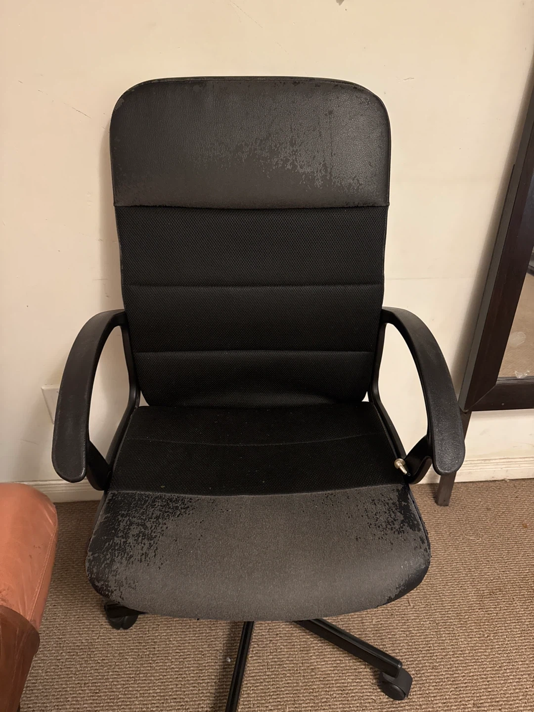 Selling a black office chair. It has some wear and tear on the seat and back, as shown in the photos. Still functional and comfortable for everyday use!