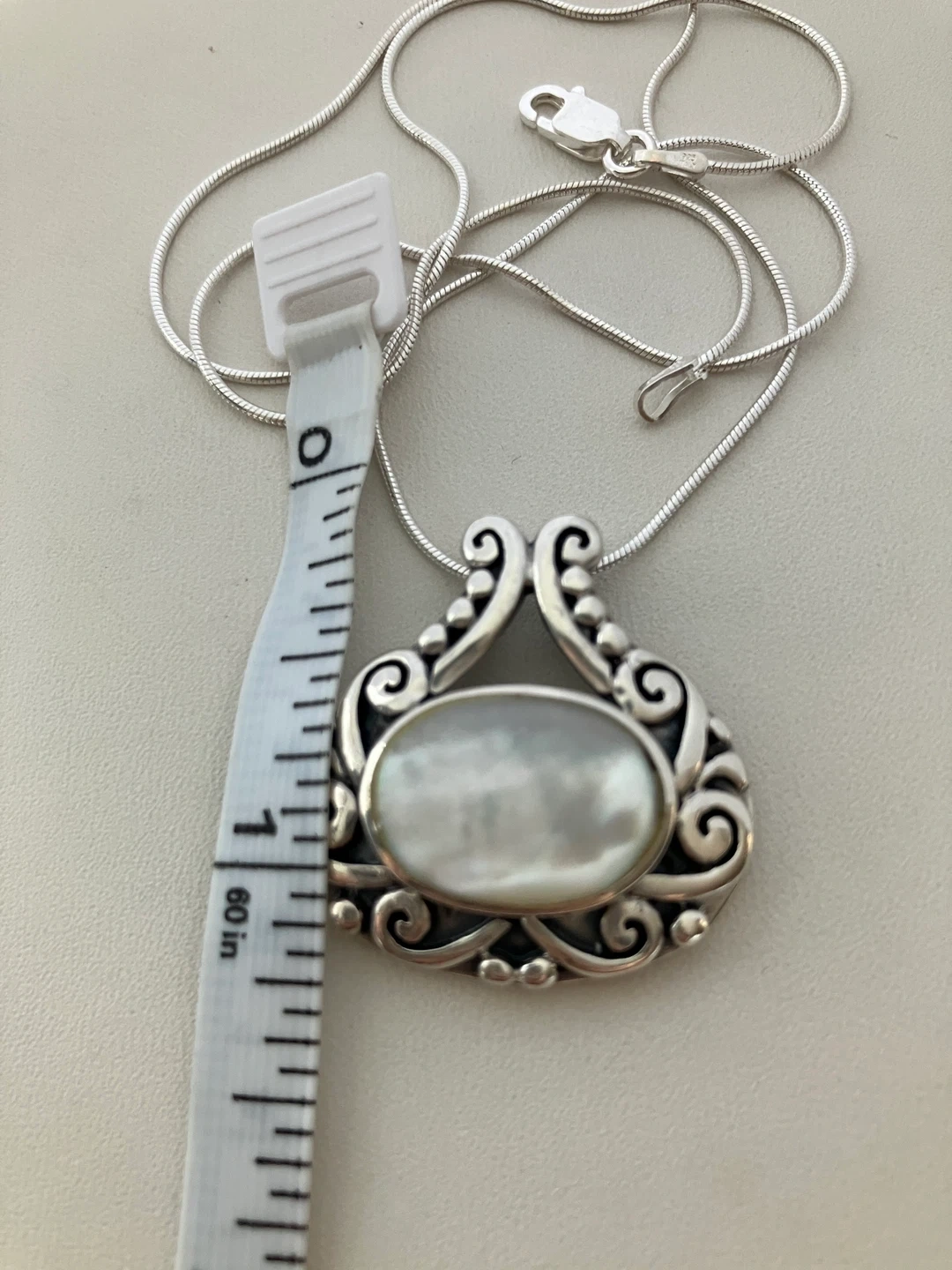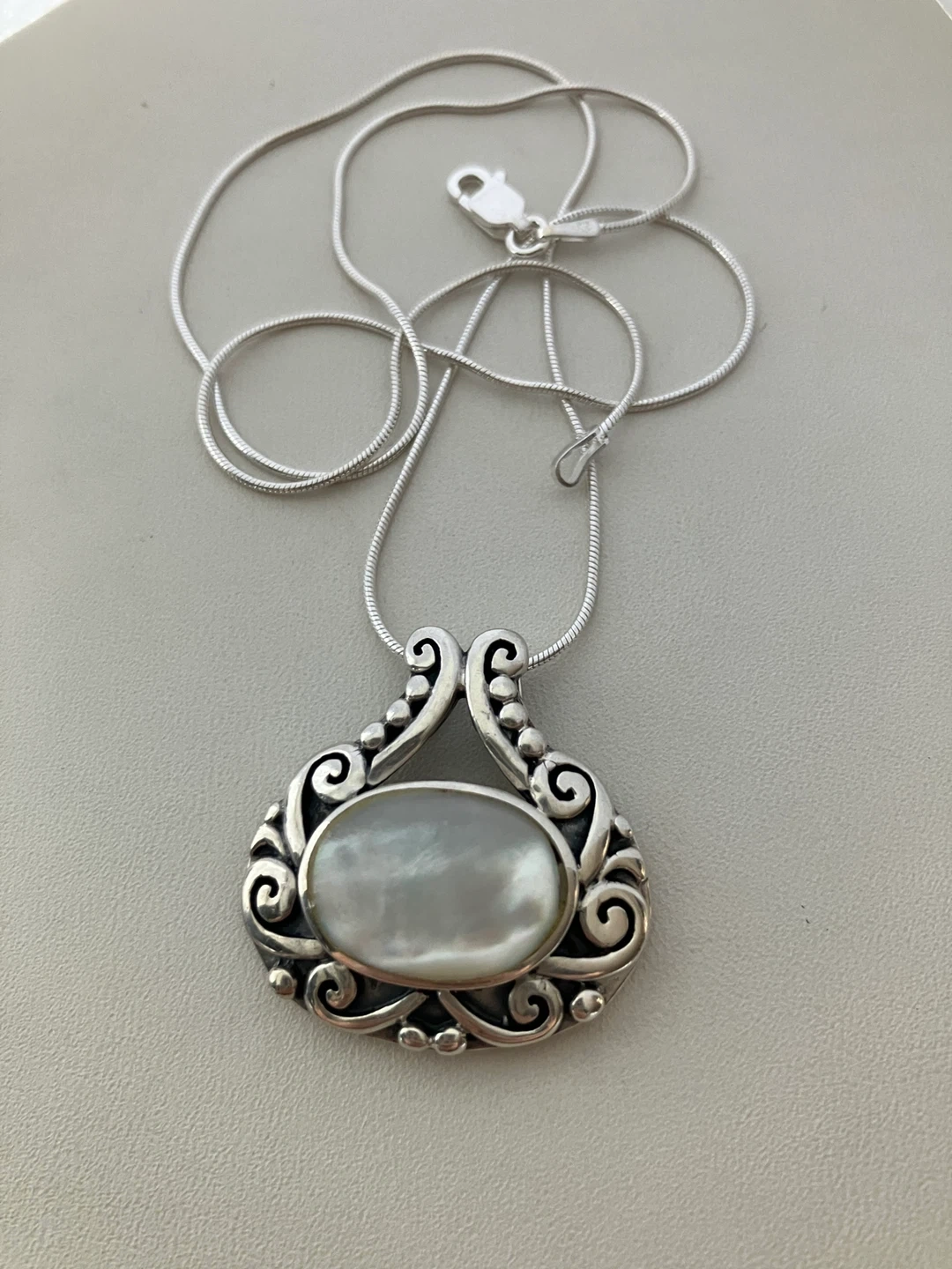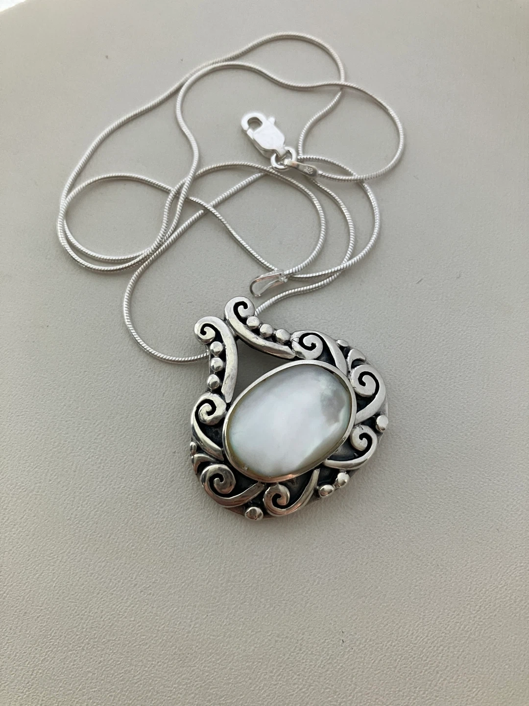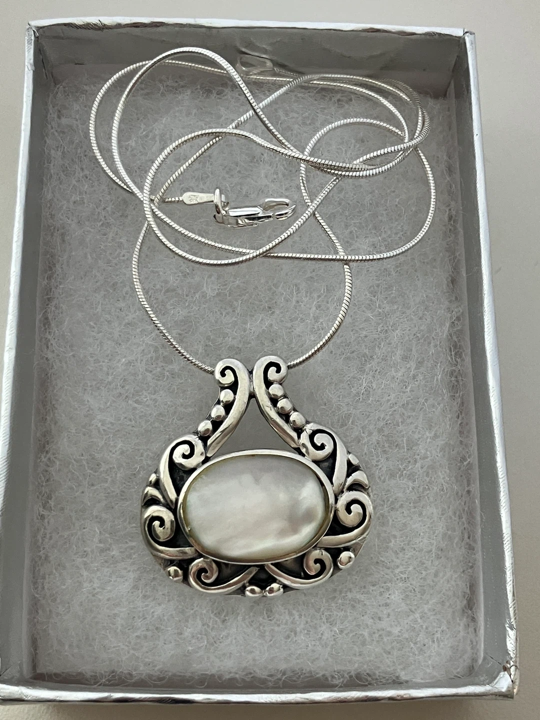 This is a beautiful sterling silver necklace with a mother of pearl pendant. The pendant has an ornate design and is in great condition. It comes in a box for safekeeping. The pendant is approximately 1.5 inches long. Comes with 18” chain .