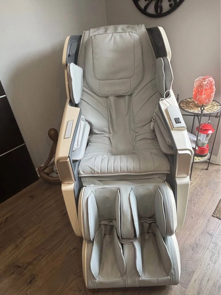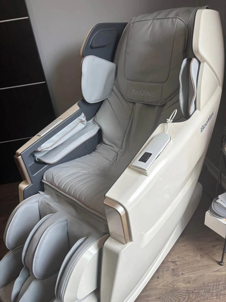 BooMas SL Track Massage Chair with AI voice control. Zero gravity, full body massage with back and leg heating. Features Thai stretching, shortcut key, auto scan, negative ions, and foot rollers. White color. Ergonomic extra-long SL track with 3D rollers massage from neck to thighs. AI voice, Color LCD remote, smartphone APP and quick button control. Built-in USB port. Adjustable width 3D massage rollers. Soles of the feet with 3 kinds of massager, Full-body airbag massage for shoulders, arms, legs, feet, etc. Choose from 12 automatic massage modes or customize your massage experience with 6 massage techniques, massage part, and airbag massage options. Lowest zero gravity angle of about 165 ° helps reduce pressure on the spine and heart. 45-second automatic scanning program scans the user's body type. Real Thai stretch function, with a footrest that can be lifted separately. Space-saving, with a Bluetooth speaker, negative ions, ambient light. No assembly required, and it's ready to use out of the box. Still under warranty. Pick up Oshawa Rossland and Thornton.