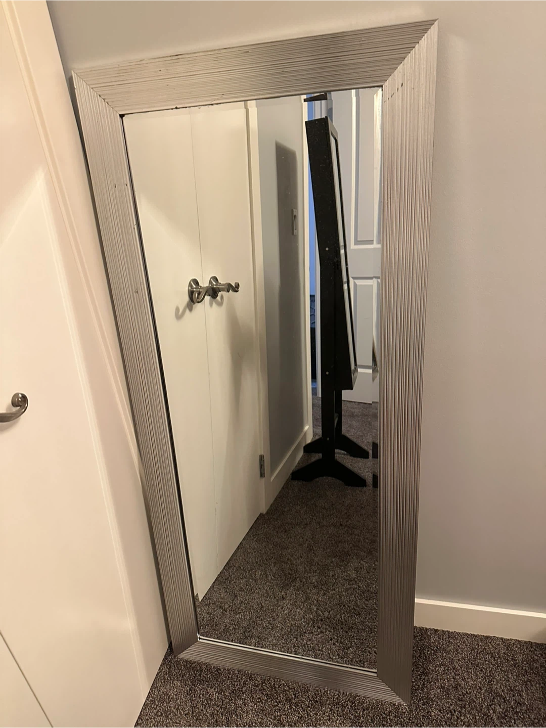 Selling a large mirror with a silver frame. It's in good condition and ready to brighten up your space! About 5ft tall. Never hung.