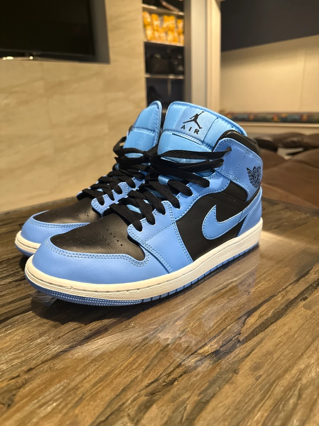 Selling a pair of Air Jordan 1 Mid sneakers in the University Blue colourway. They are a US size 9.5. The manufacturing date on the label is 2022 December 14. These shoes are in great condition and ready for a new home!