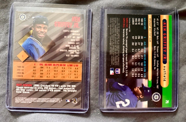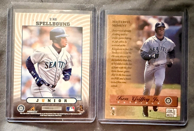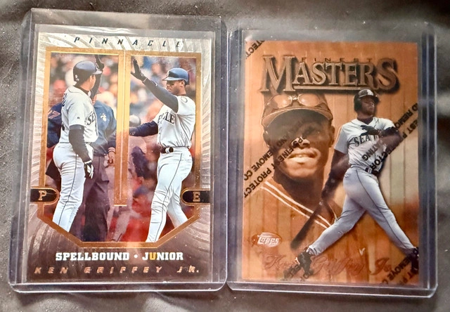 I am offering a set of four Ken Griffey Jr. baseball cards, showcasing iconic moments from his career with the Seattle Mariners. These cards feature various designs, including Pinnacle and Topps Masters series, each highlighting Griffey's skill and impact on baseball. These cards are in used condition, showing some wear consistent with age, but remain a great addition to any sports memorabilia collection. Given their collectibility and the player's status, I'm pricing these at $75 CAD. If the ad is still up, the cards are still available!