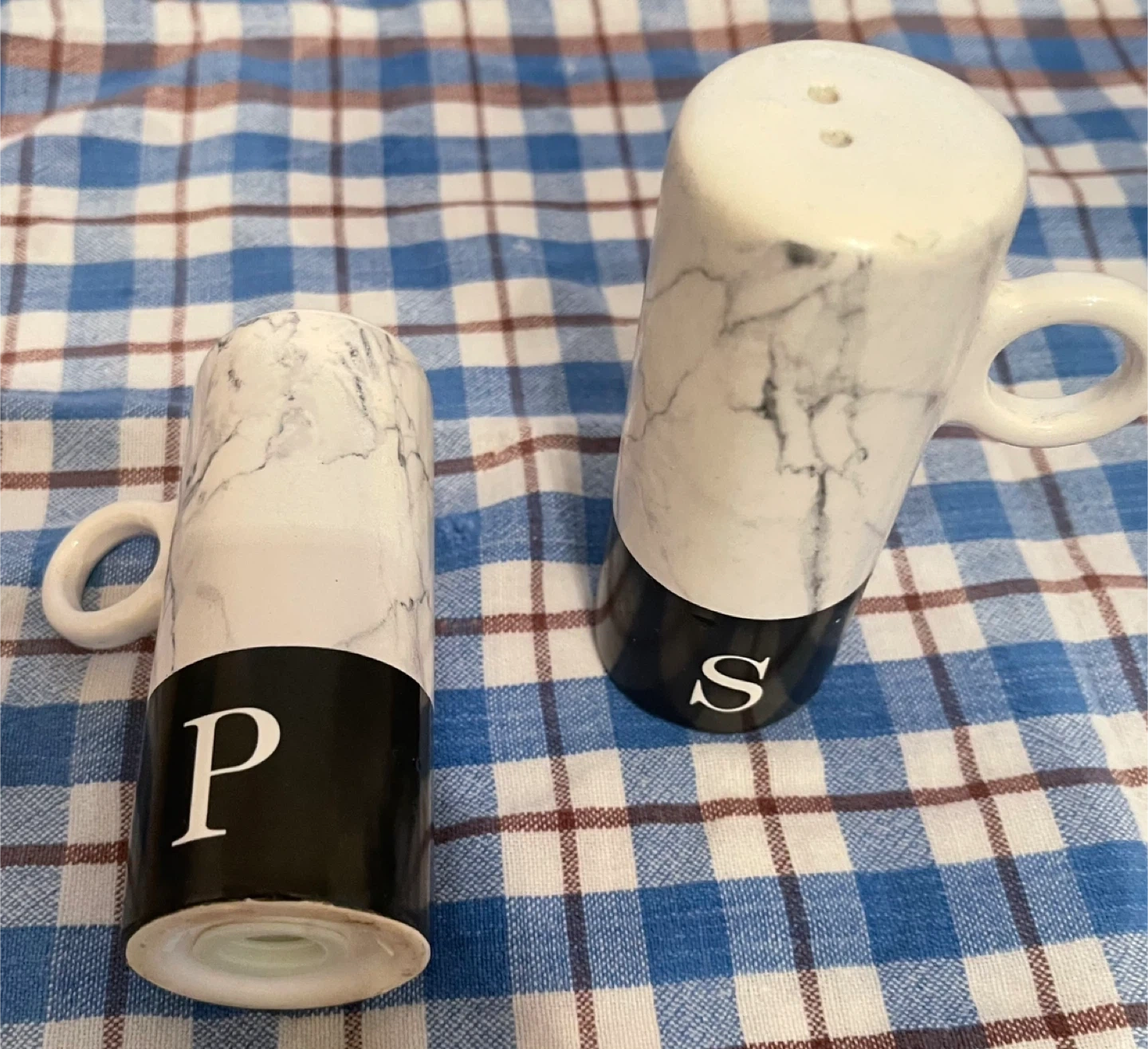 🥕 Selling a set of marble salt and pepper shakers. They have a modern design with a white marble pattern on the top and a black base with the letters 'S' and 'P' respectively. Great for adding a touch of elegance to your dining table!