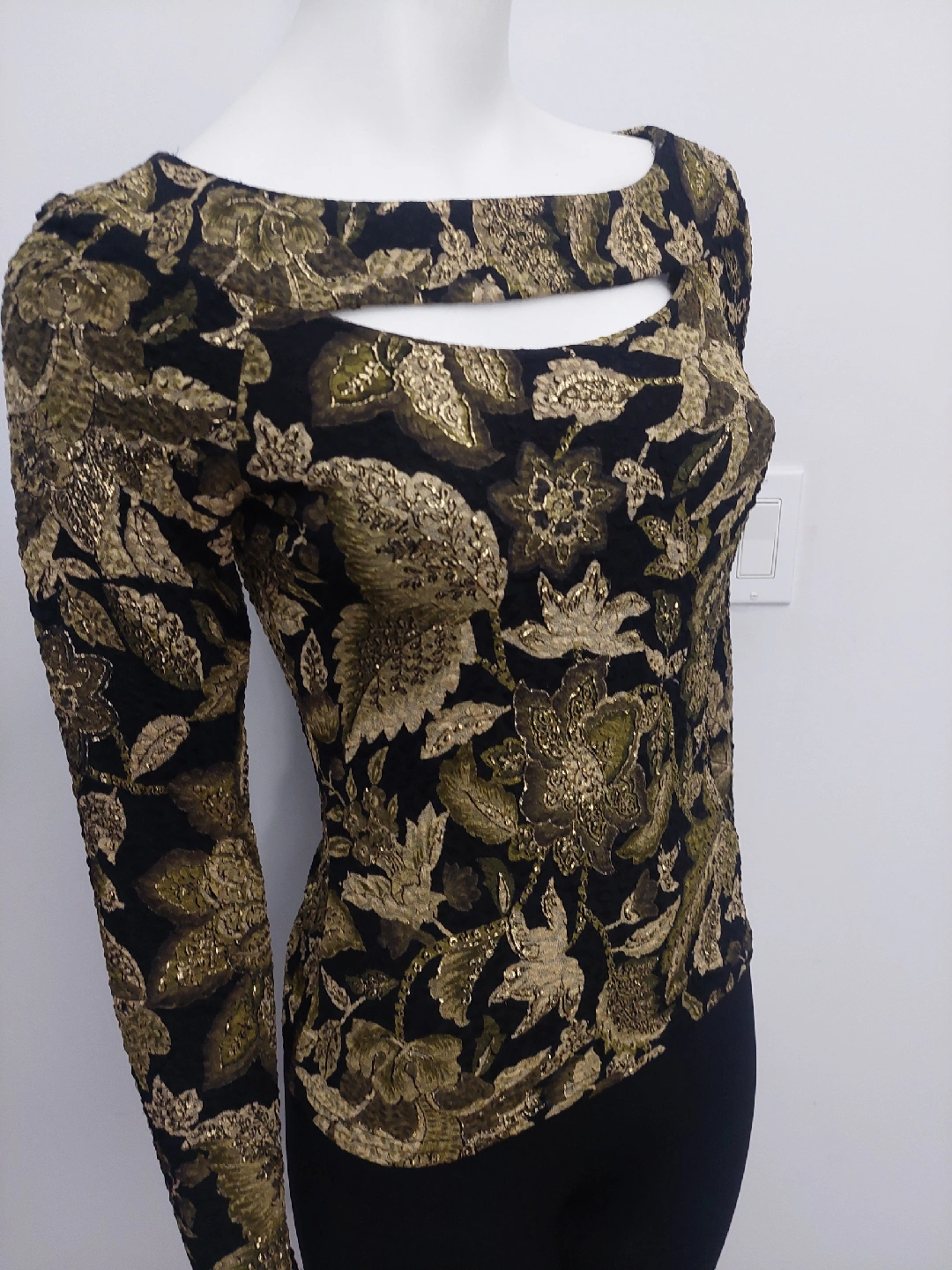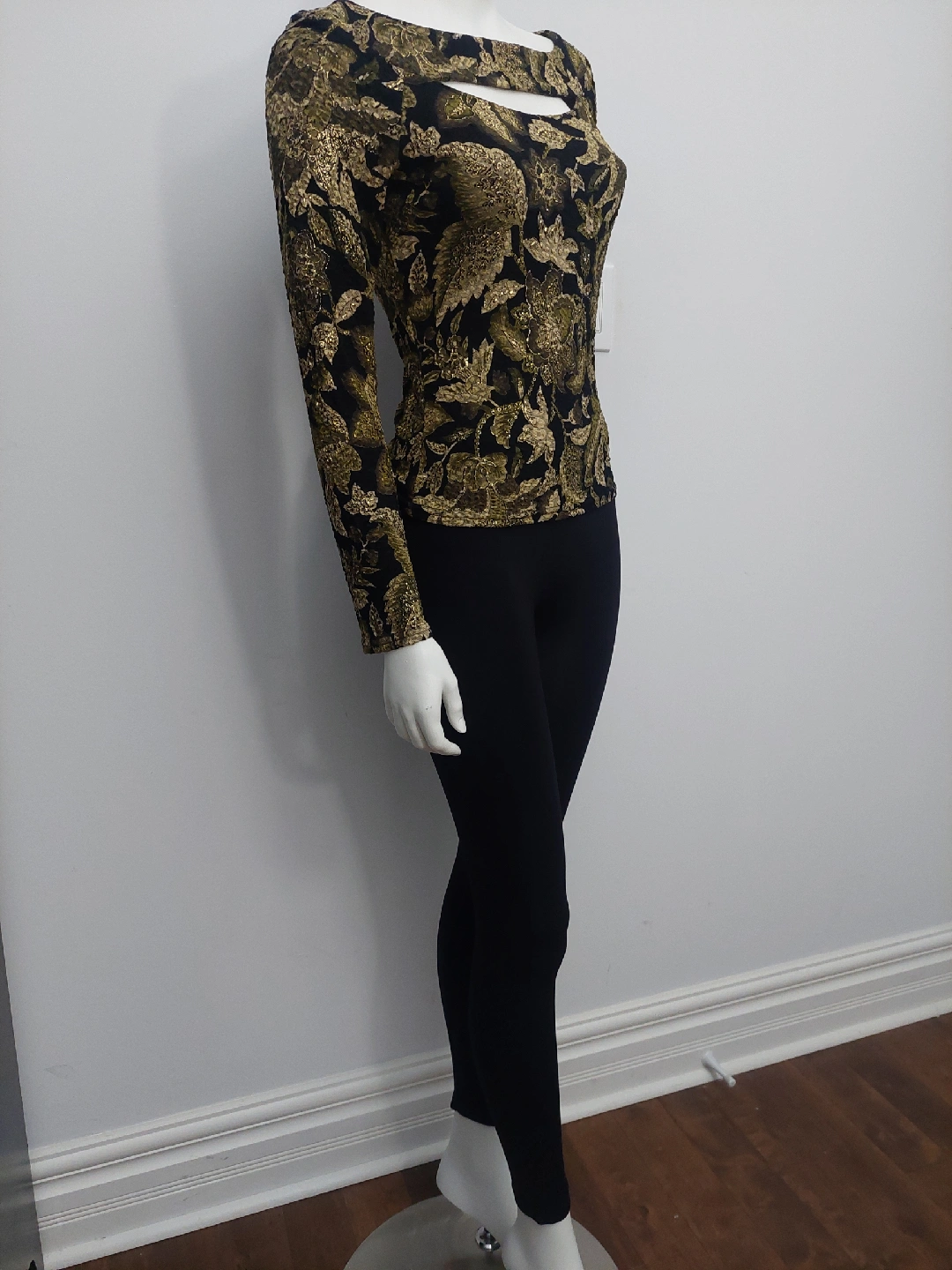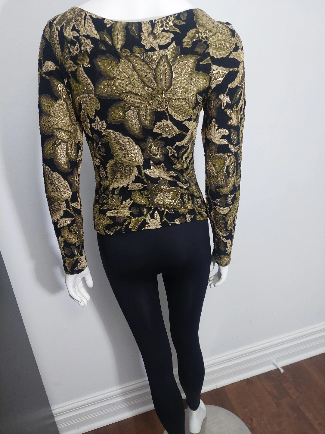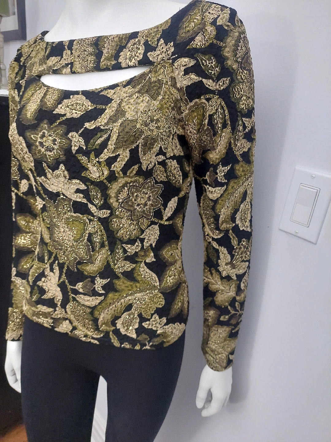 Selling a beautiful Cartise International top in size small! It features a unique floral pattern in gold and black, perfect for a night out or special occasion. The material is a blend of 60% acetate, 35% polyester, and 5% spandex, making it comfortable and stretchy. It's in great condition.