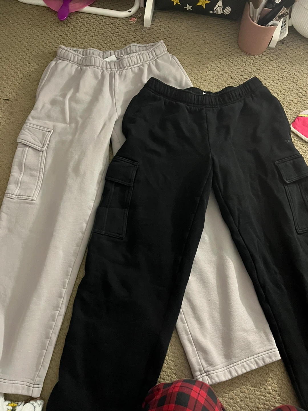 Selling a pair of TNA Sweatfleece Cozy Fleece cargo pants in size small! They're super comfy and in great condition. One pair is a light grey colour and the other is black. Perfect for lounging or running errands around town. The black is slightly faded around the pockets, but no other damage or wearing out. Comes from a smoke free and pet free home