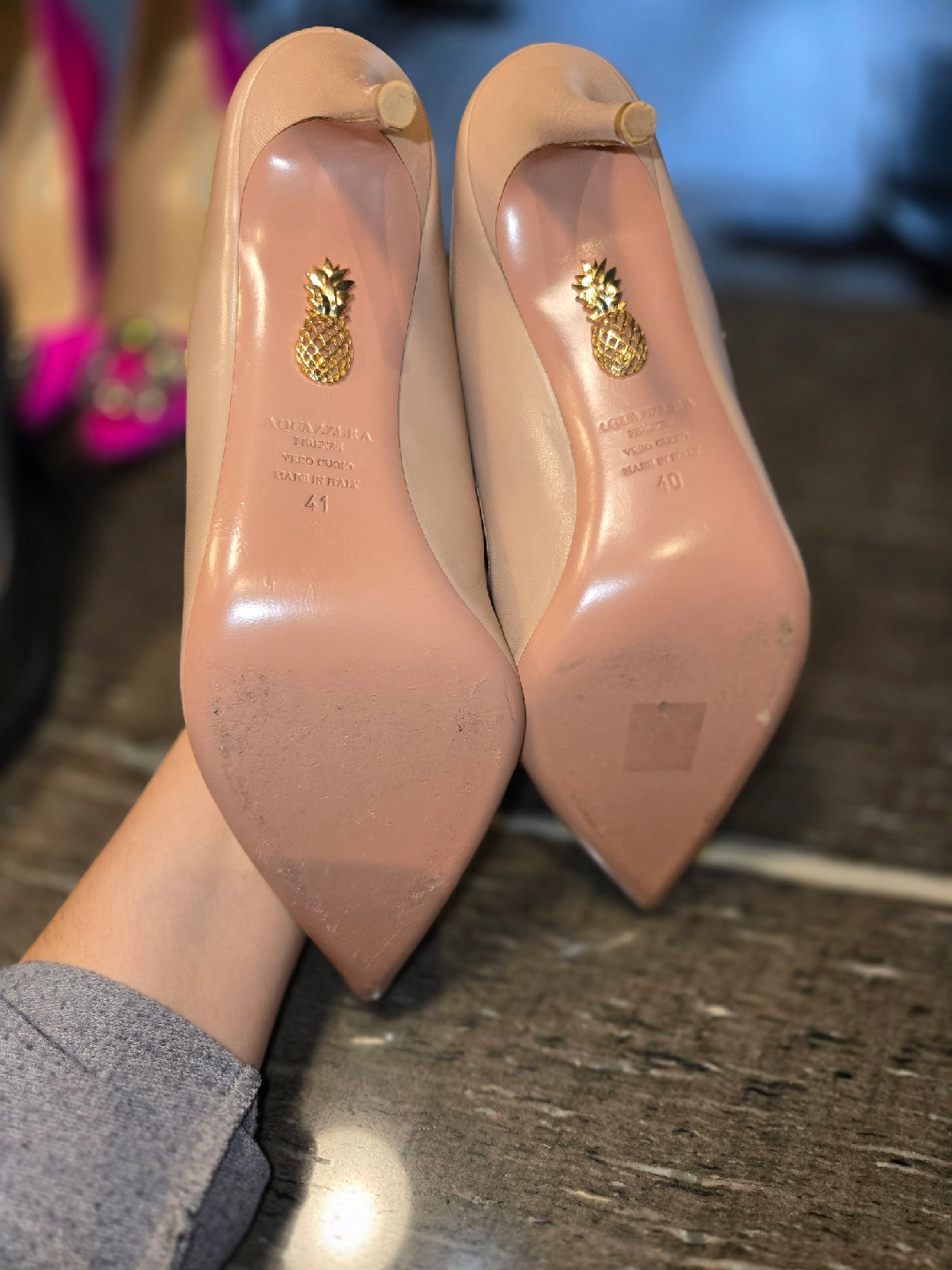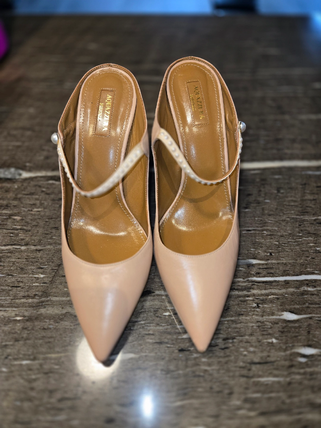 205These are a beautiful pair of Aquazzura leather mules in a size 41. They feature a delicate pearl embellishment on the strap. They are in great condition and would be a lovely addition to any wardrobe