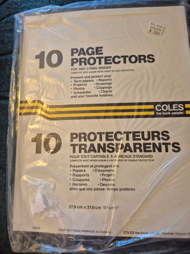 89Selling a package of 10 page protectors by Coles. These are for any 3-ring binder and come complete with an album paper sheet in each protector. They are still sealed in the original packaging and are in new condition! They measure 27.9 cm x 21.6 cm (11" x 8½")
